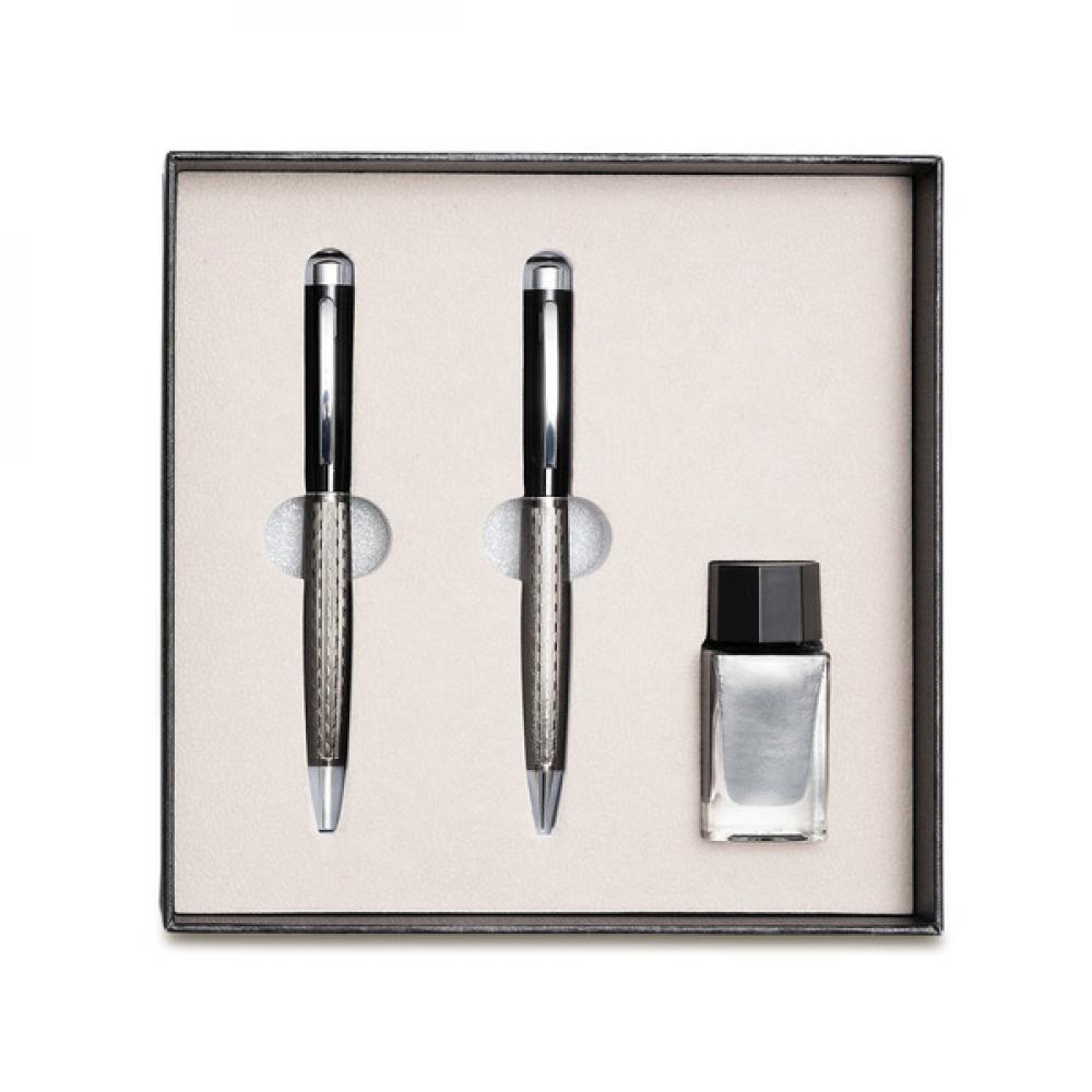 Элегантный письменный набор, состоящий из металлической перьевой ручки, шариковой ручки и флакона синих чернил. Упакован в подарочную коробку. Размеры ручки и перьевой ручки: Ш140 x В20 x Г10 мм
