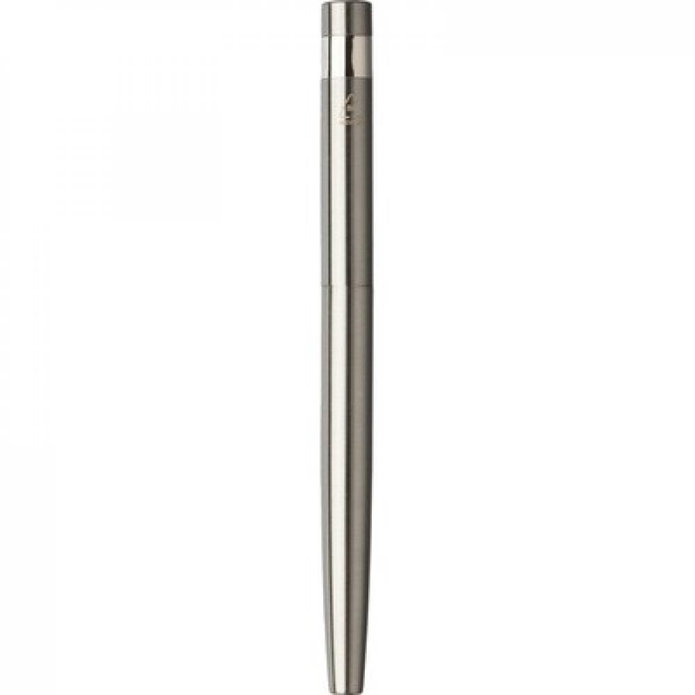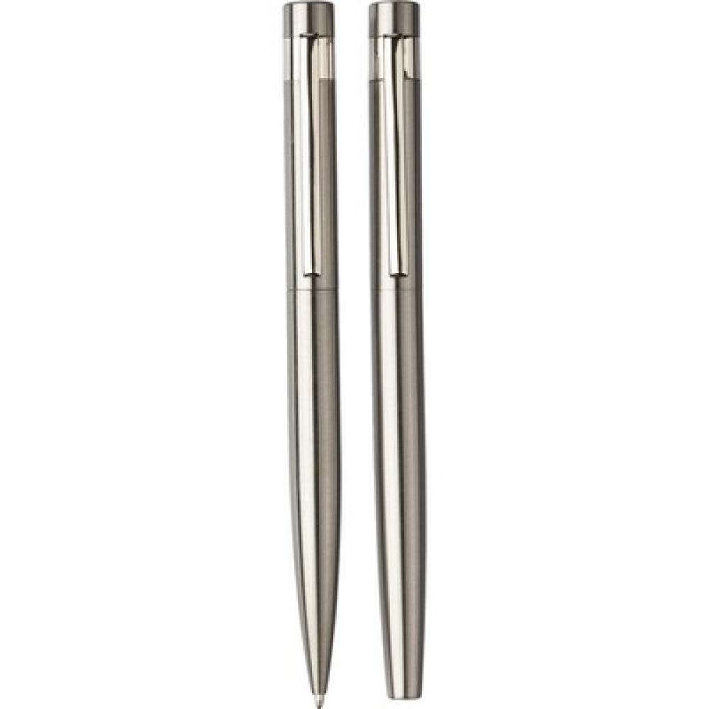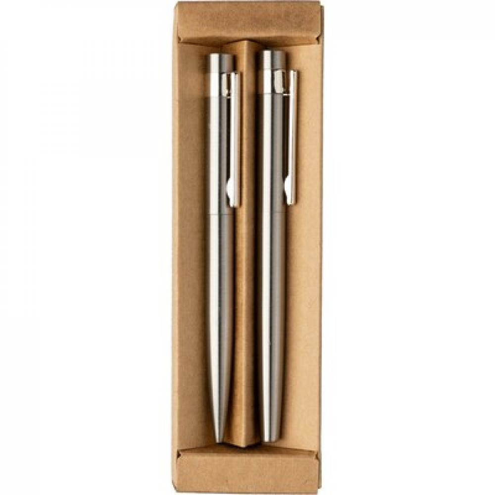 Набор для письма, включающий ручку-роллер и ручку с поворотным механизмом, обе пишут синим цветом, с иконкой из переработанной стали на изделиях, упакованный в коробку из крафт-бумаги, изготовлен из переработанной нержавеющей стали.