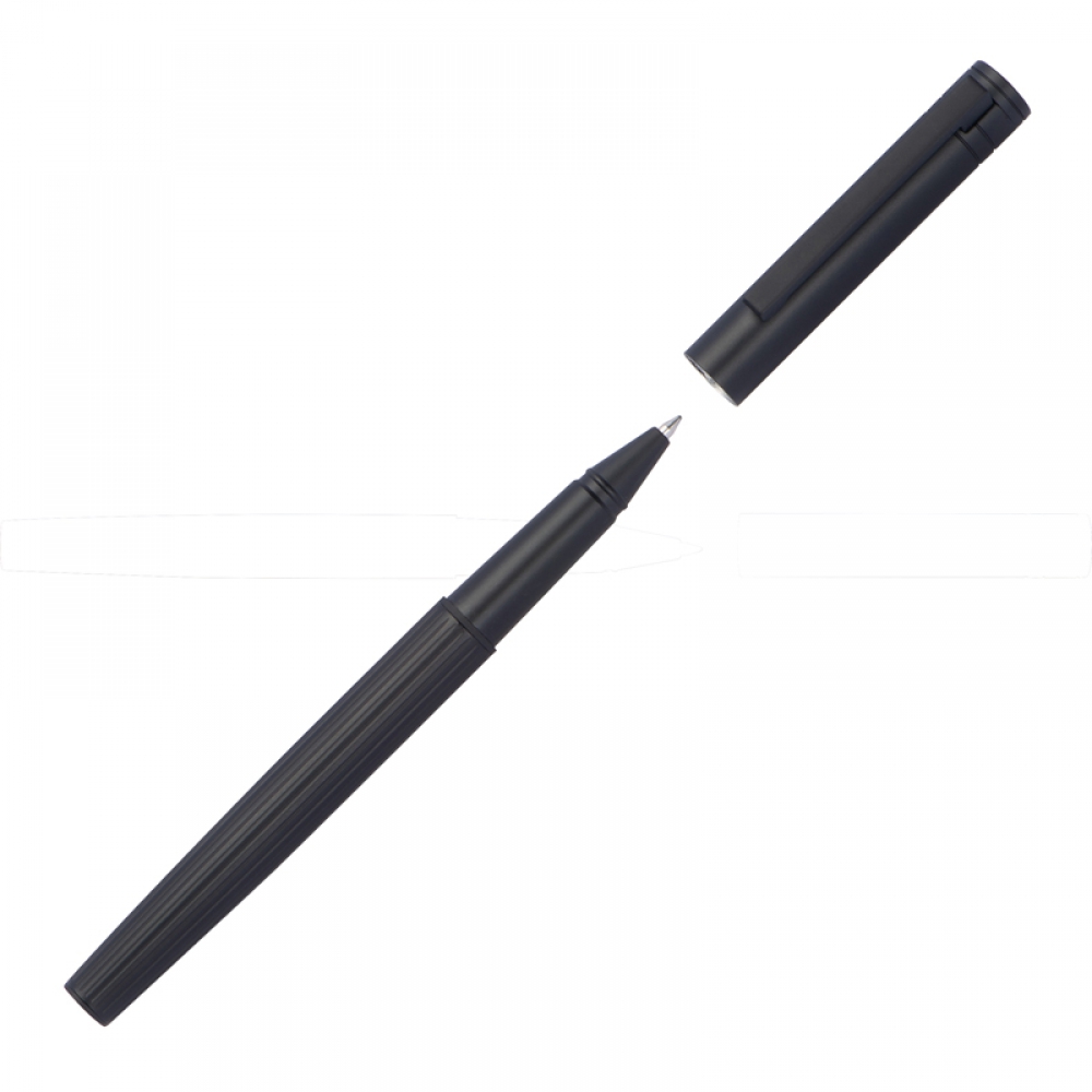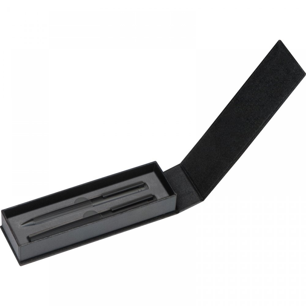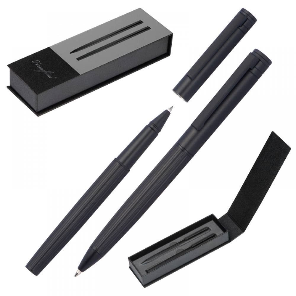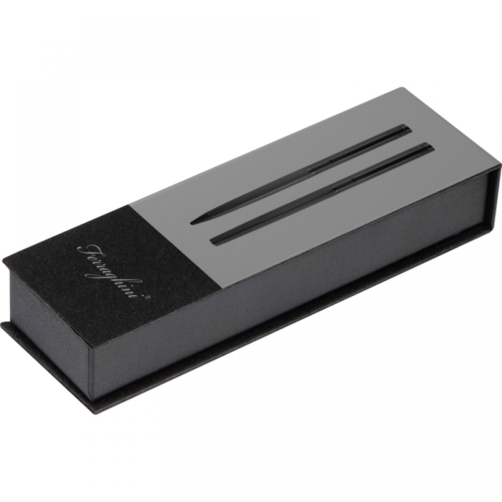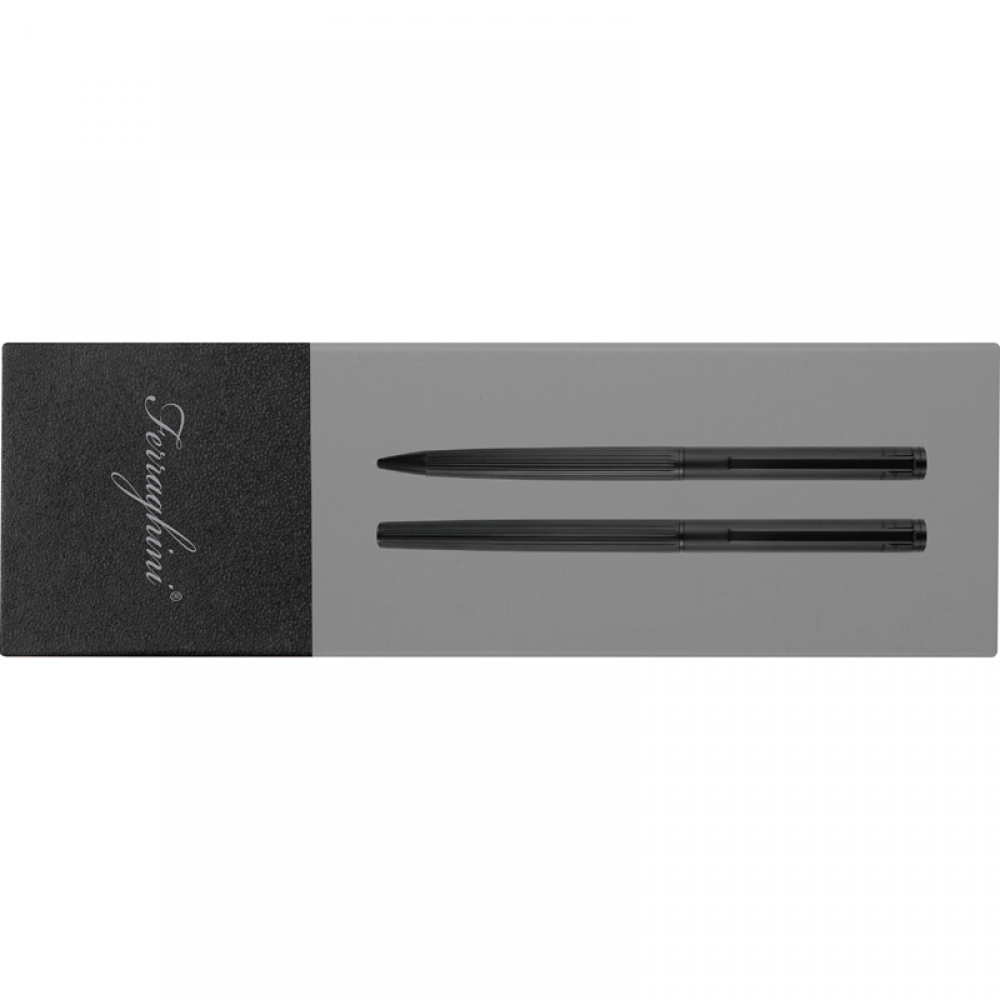 Письменный набор Ferraghini, состоящий из ручки и роллера (цвет чернил синий), выполненный из металла с ребристой поверхностью.