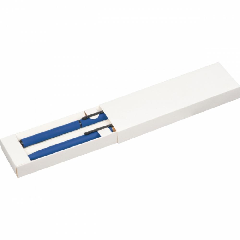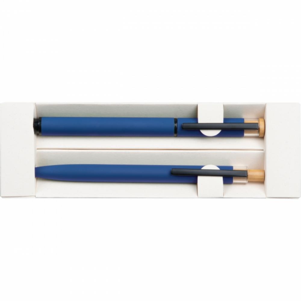 Набор для письма, состоящий из ручки с полугелевой синей пастой и роллера, изготовленного из переработанного алюминия, с металлической клипсой и бамбуковым толкателем, в экологичной упаковке.
