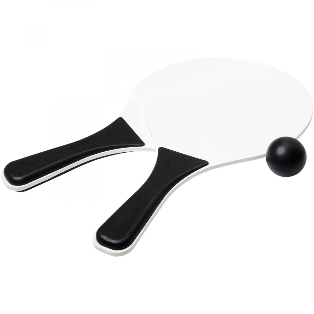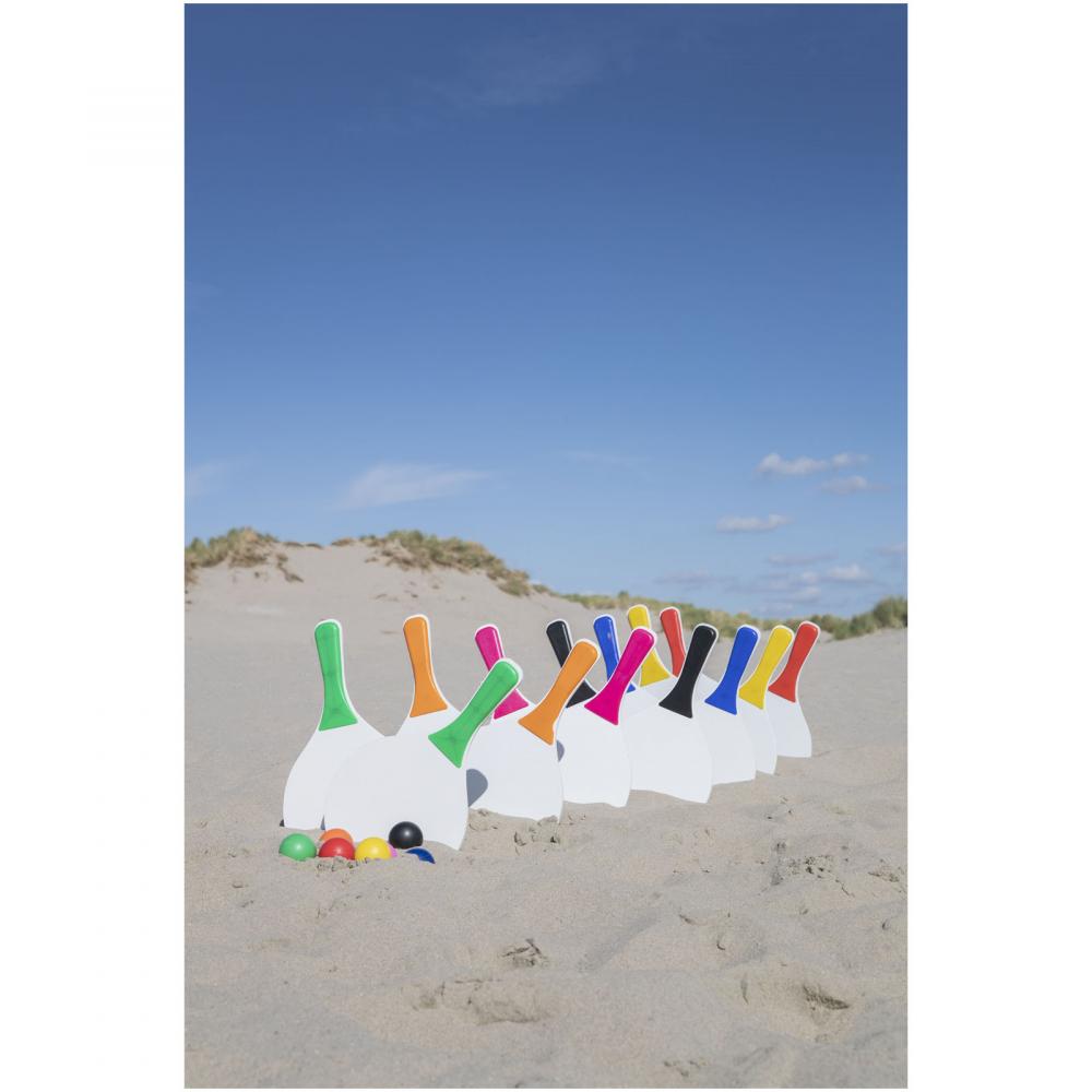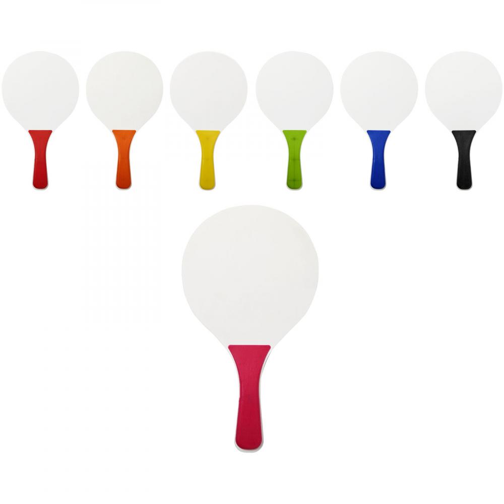 Всегда весело с этим пляжным игровым набором, представленным в широком ассортименте цветов. Этот прочный набор для пляжных игр изготовлен из МДФ дерева с цветной ручкой из полипропилена. В комплекте идет мягкий мяч такого же цвета, упакованный в сетку, что позволяет легко взять его с собой на веселый день на пляже.