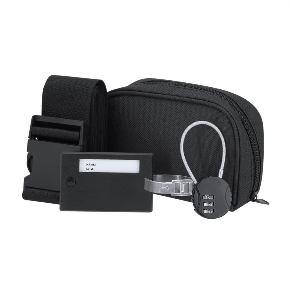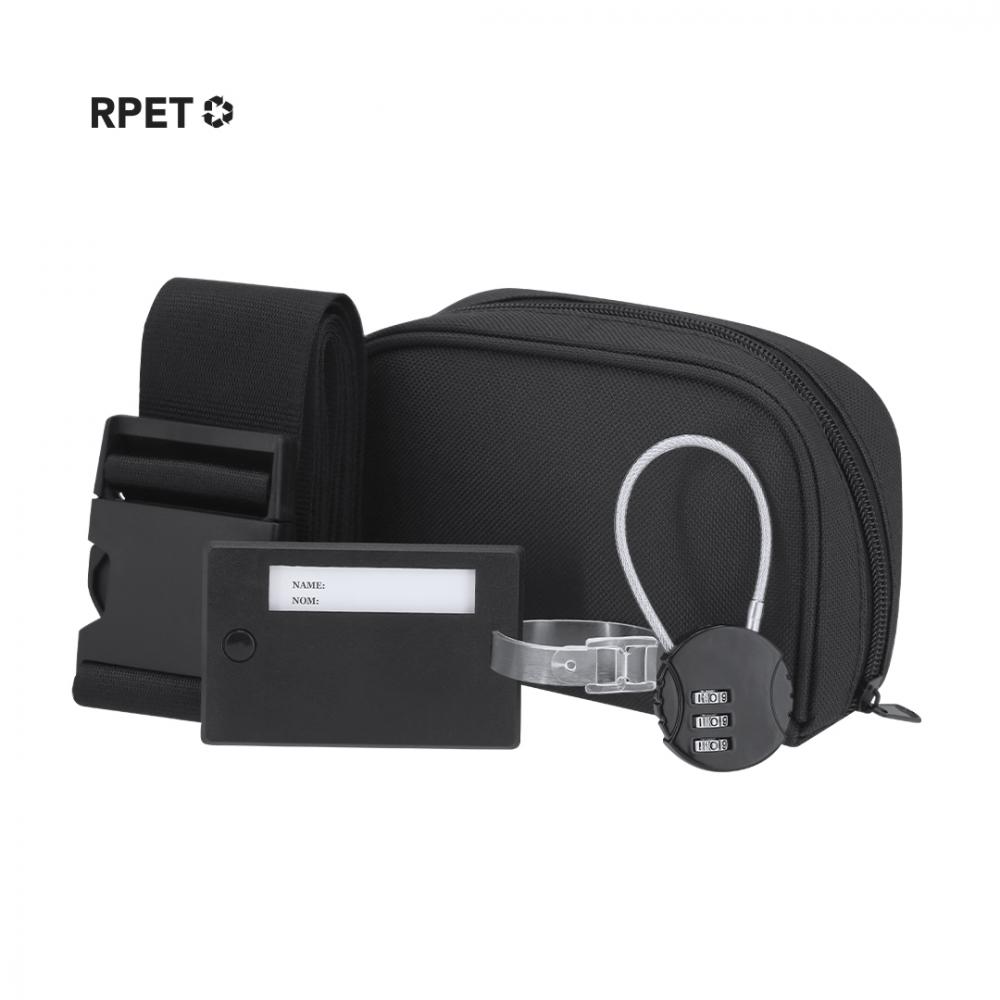 Набор для путешествий. Включает: регулируемый ремень для чемоданов, идентификатор для багажа и замок с трехзначным числовым кодом и стальной защелкой. Представлен в чехле из RPET с молнией и двумя внутренними карманами. Включает этикетку RPET. Материал RPET изготовлен из переработанного пластика для поощрения повторного использования пластиковых отходов и помощи в обеспечении устойчивости планеты. 3 аксессуара. Полиэстерный мешочек RPET