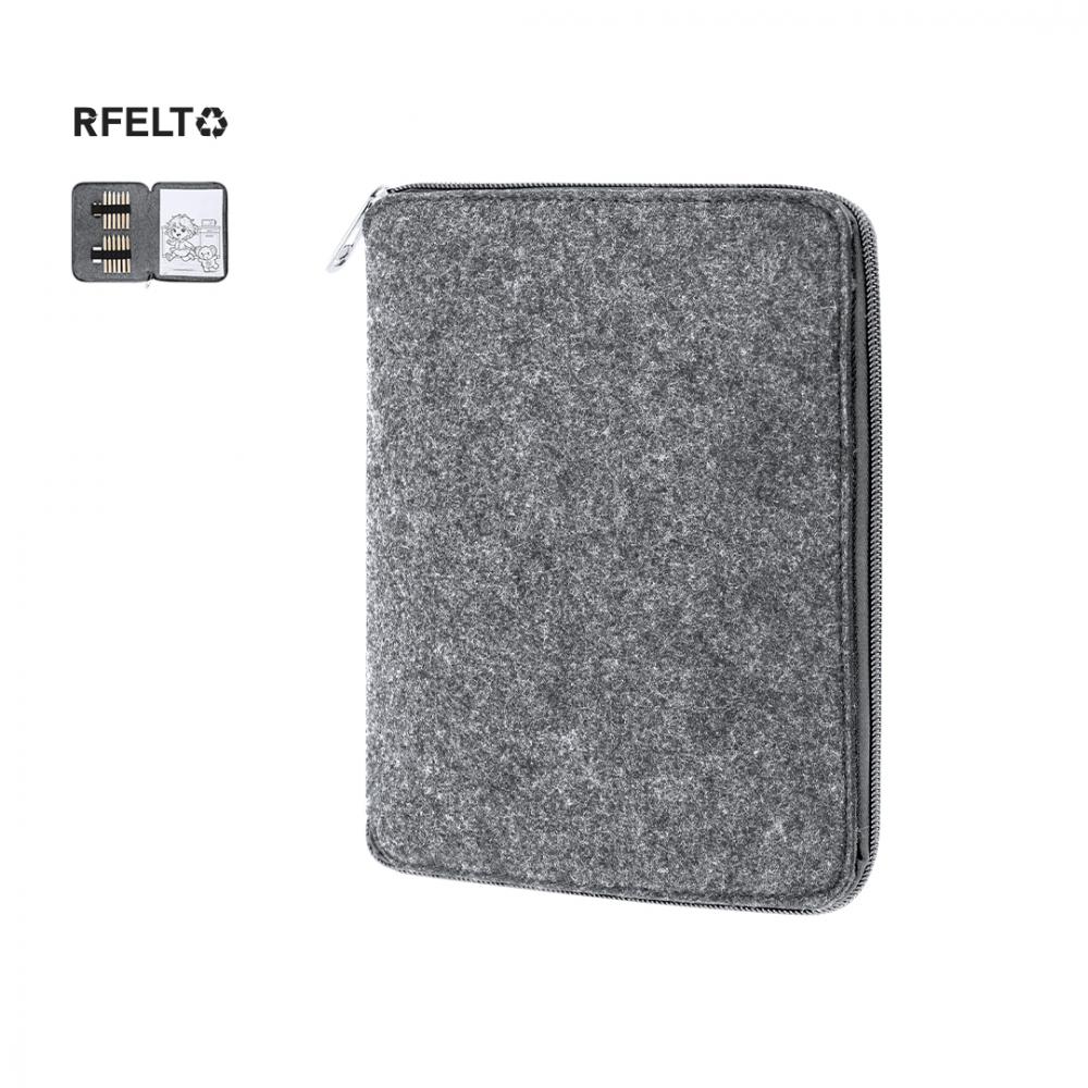 Набор цветных карандашей в чехле из фетра RPET. Включает 11 гексагональных цветных карандашей, 1 ластик, 1 деревянную точилку и 60 страниц с черно-белыми рисунками для раскрашивания. Представлен в практичном чехле с молнией в двухцветном дизайне и внутренними эластичными петлями для организации аксессуаров. С этикеткой RPET. Фетр RPET - это результат сочетания процесса переработки пластиковых материалов с древней техникой изготовления фетра, что приводит к созданию экотрендового материала, который помимо того, что он перерабатывается, также подлежит переработке.