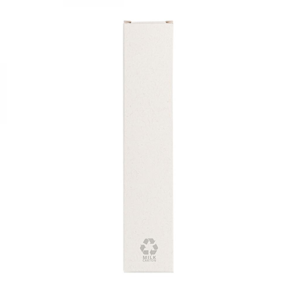 Набор для офиса или школы из переработанной бумаги от молочных упаковок. Включает в себя шариковую ручку с синим стержнем, карандаш с долгим сроком службы, бамбуковую линейку и ластик. Все упаковано в коробку.