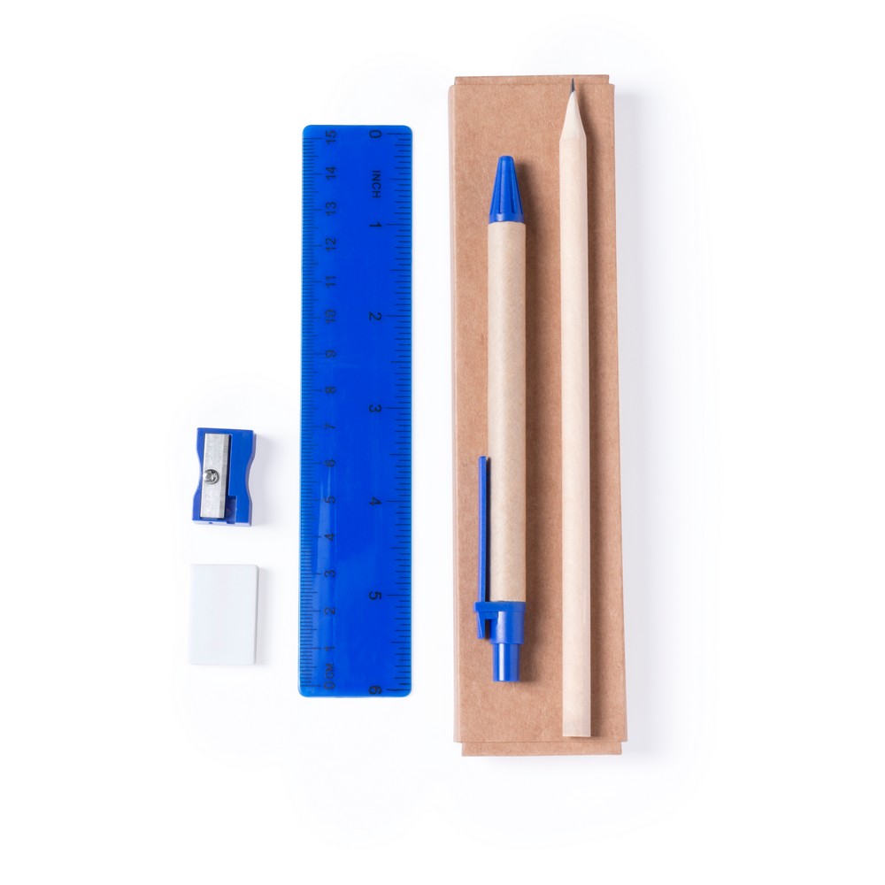 Школьный набор в коробке с карандашом, шариковой ручкой с корпусом из переработанного картона, ластиком, точилкой для карандашей и линейкой