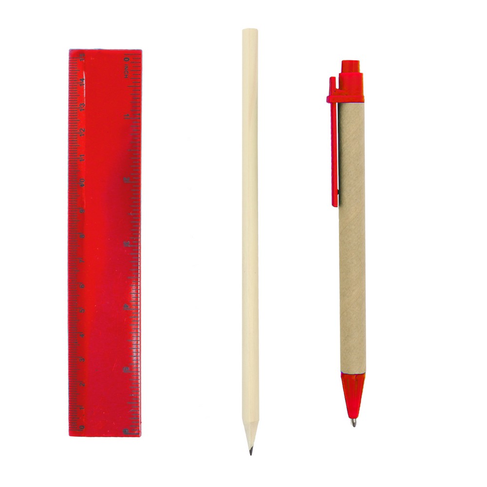 Школьный набор в коробке с карандашом, шариковой ручкой с корпусом из переработанного картона, ластиком, точилкой для карандашей и линейкой