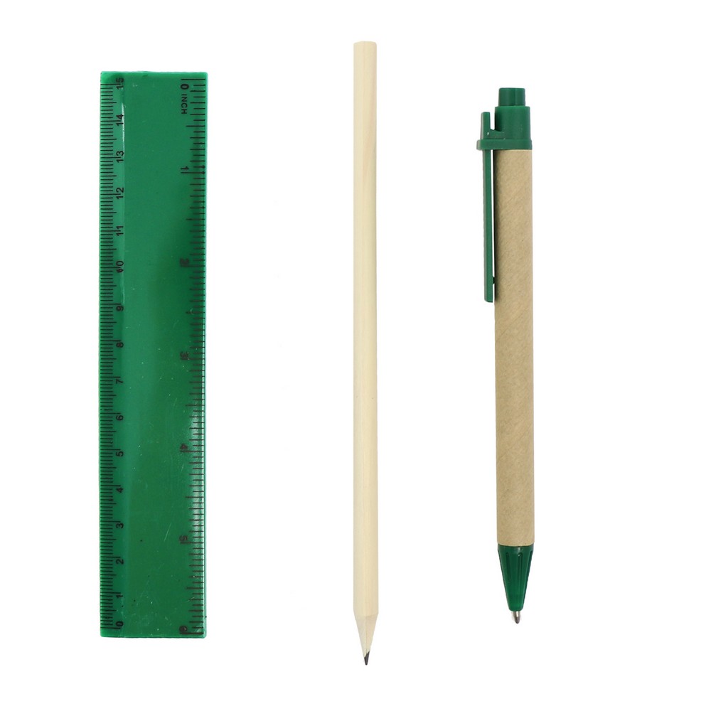 Школьный набор в коробке с карандашом, шариковой ручкой с корпусом из переработанного картона, ластиком, точилкой для карандашей и линейкой