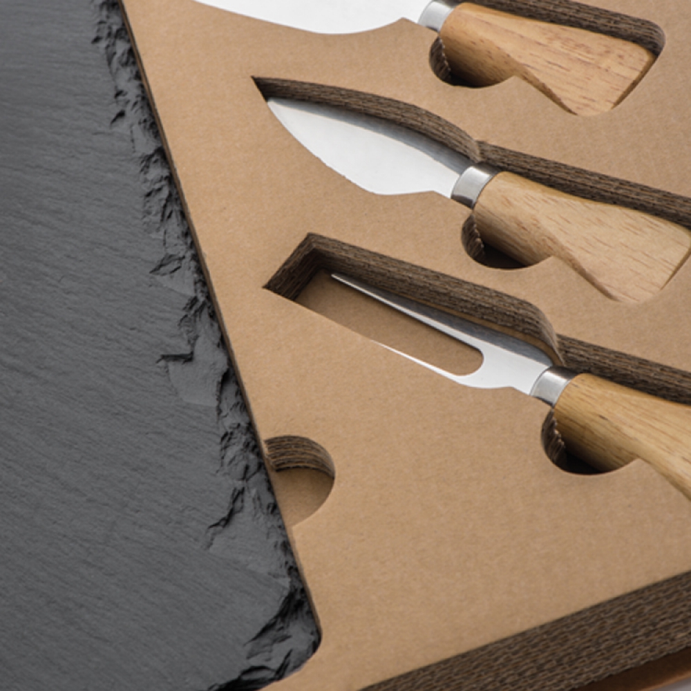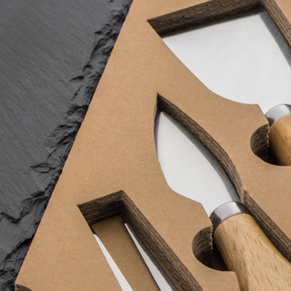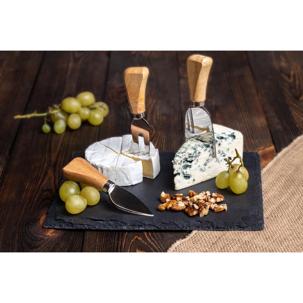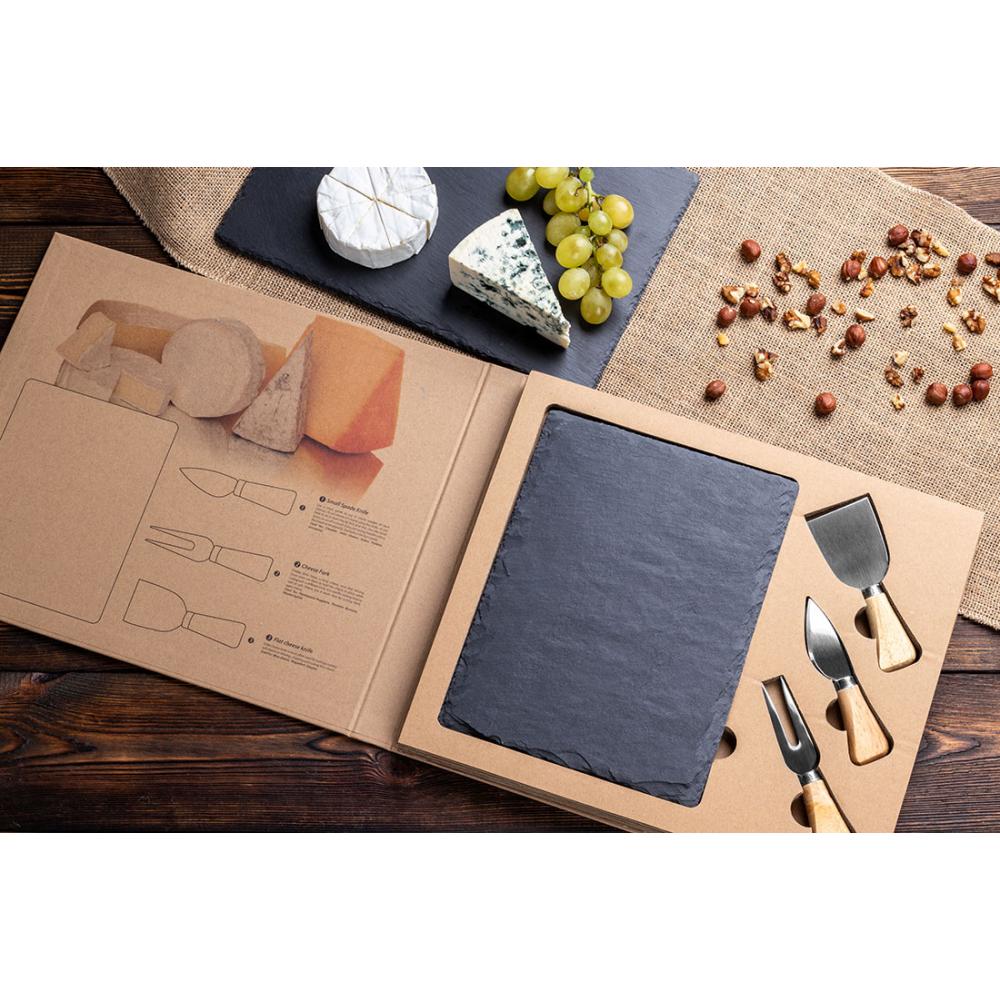 Набор для сыра в наборе с одним маленьким и одним плоским ножом и вилкой. Все упаковано в картонной подарочной коробке.
