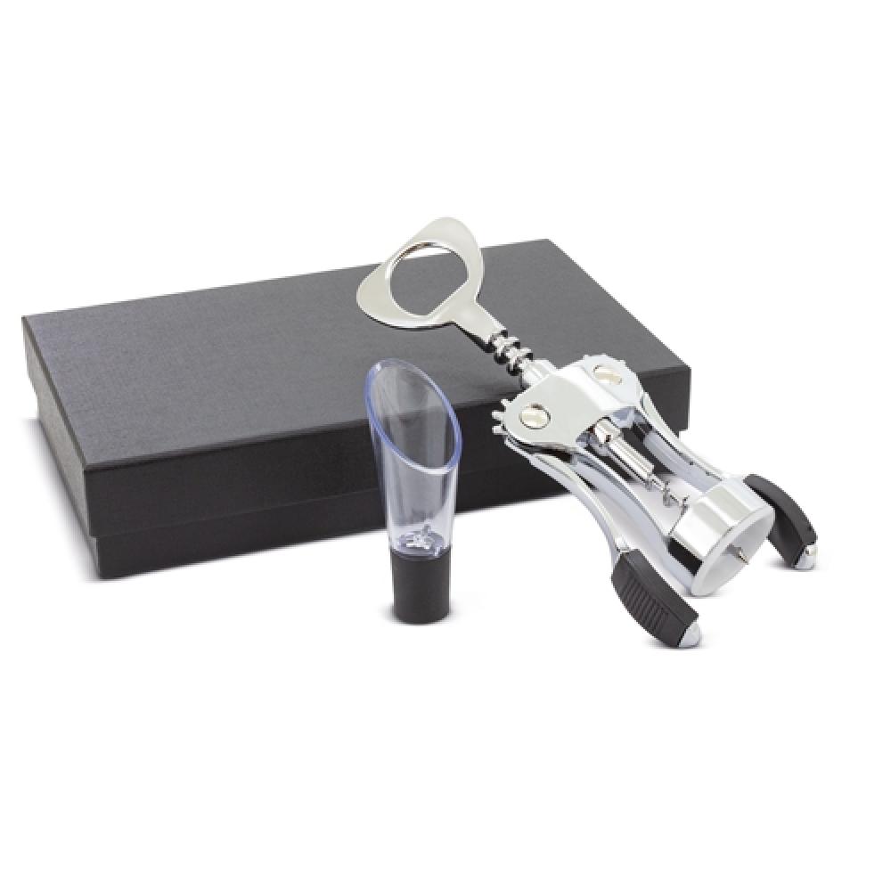 Полный подарочный набор, включает в себя открывашку и налейку для вина.