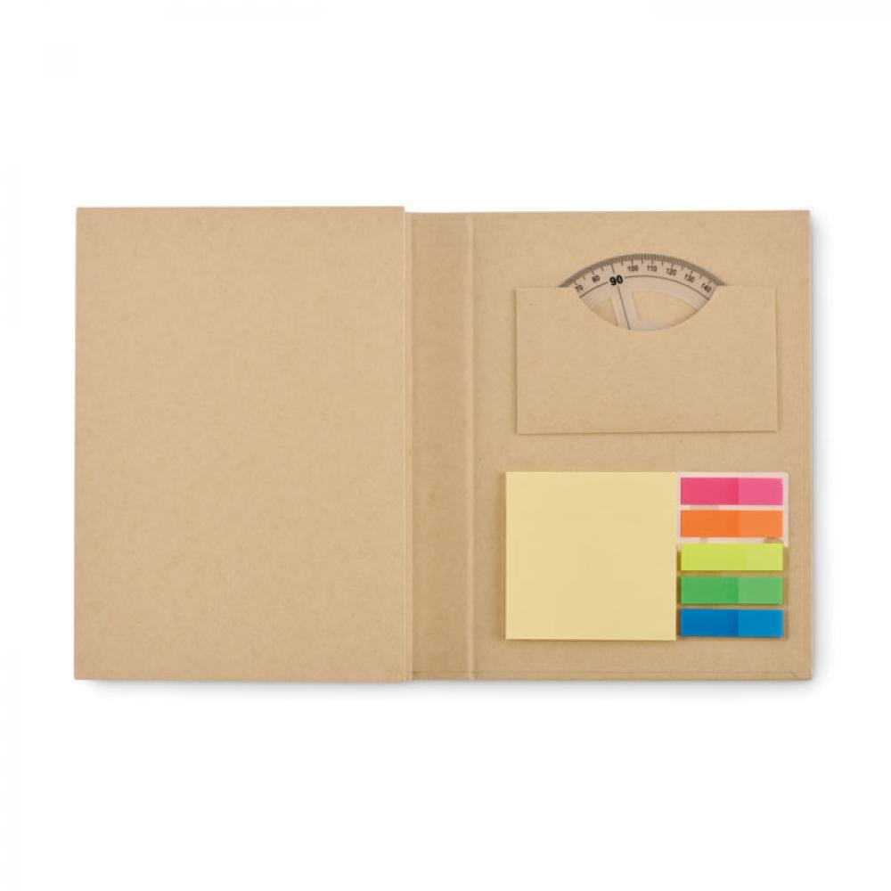 Набор для заметок в обложке из переработанного картона, состоящий из 70 линованных листов из переработанной бумаги, набора стикеров, шариковой ручки из пластика и бумаги, пластиковой точилки, ластика, 2 деревянных карандашей, деревянной линейки 15 см и транспортира.