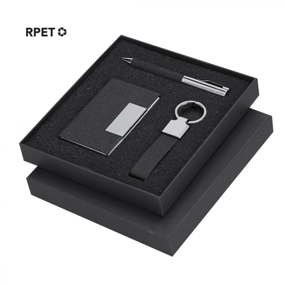 Элегантный набор из RPET с черным битонным покрытием и металлическими деталями. Включает в себя: - Кардхолдер из RPET с черным битонным экстерьером, металлическими деталями, 1 внутренним отделением и магнитной системой закрытия. - Ручка из RPET с черным битонным покрытием и металлическими деталями. С поворотным механизмом и синим чернилами. - Брелок из RPET с черным битонным покрытием и хромированными аксессуарами. Представлен в индивидуальном черном футляре. В комплекте черная внутренняя карточка с этикеткой RPET. Материал RPET изготовлен из переработанного пластика для поощрения повторного использования пластиковых отходов и помощи в сохранении планеты.