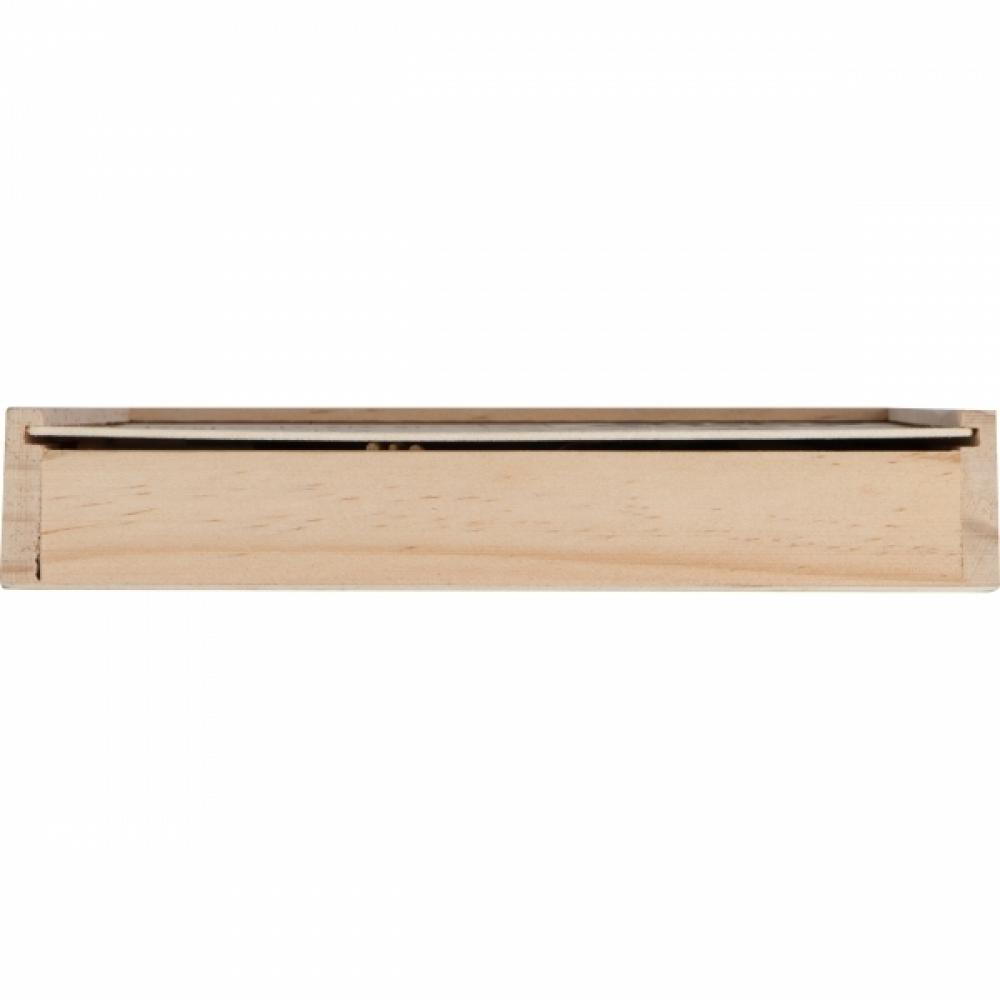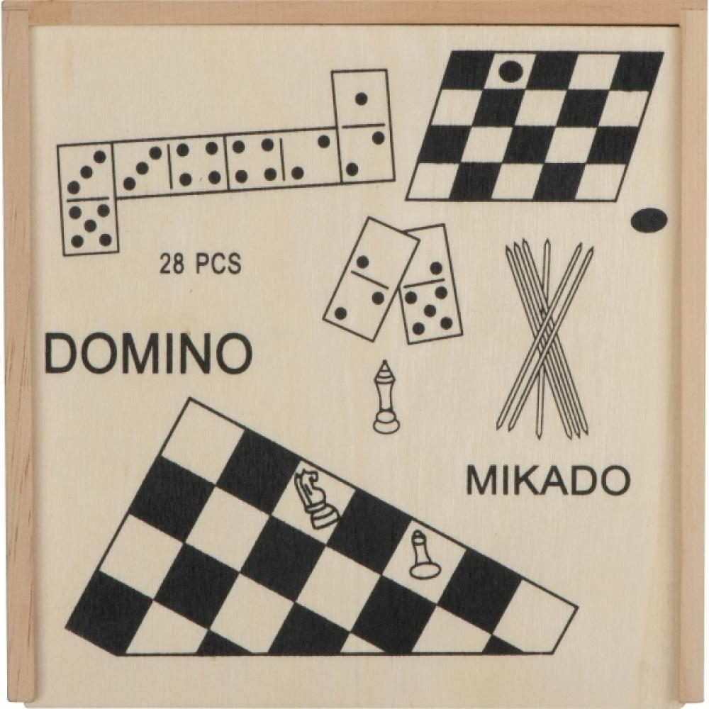 Деревянный ящик с 4 разными играми внутри – шахматы, шашки, микадо и домино.
