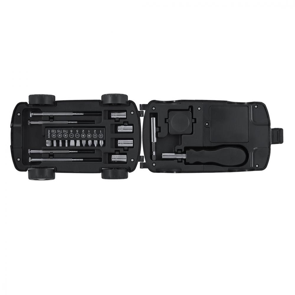 Набор инструментов в форме автомобиля с LED-фонариком. Включает в себя 20 инструментов. В комплекте: - Набор прецизионных отверток (плоские и крестообразные) - Инструмент для ремонта - Многофункциональная рукоятка с плоскими и звездообразными насадками для отверток - Гаечные ключи для шестигранных гаек - Рулетка. С фонариком с 2 встроенными светодиодами в корпусе, питаемыми 4 батарейками типа AAA (не включены).