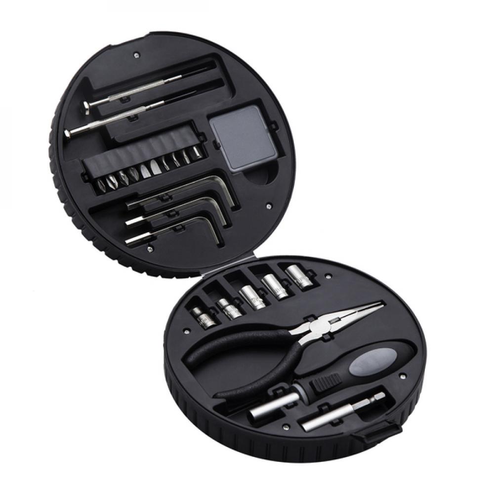 Набор из 24 инструментов в коробке для хранения, выполненной в форме шины. Он состоит из ручки, удлинительной планки, длинногубцев, рулетки, 2 прецизионных отверток, 3 шестигранных ключей, 5 головок и 10 бит. Возможна полноцветная печать (УФ).