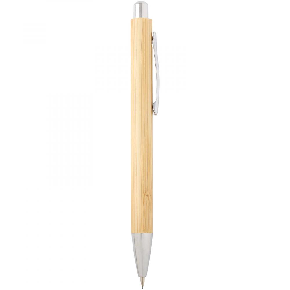 Набор Oblys состоит из шариковой ручки и механического карандаша, оба с корпусами из бамбука. Шариковая ручка оснащена черным стилусом и хромированным металлическим зажимом. Цвет чернил: черный. Размер наконечника: 1,00 мм. Длина письма: 600 метров. Механический карандаш также имеет хромированный металлический зажим. Размер наконечника: 0,5 мм.