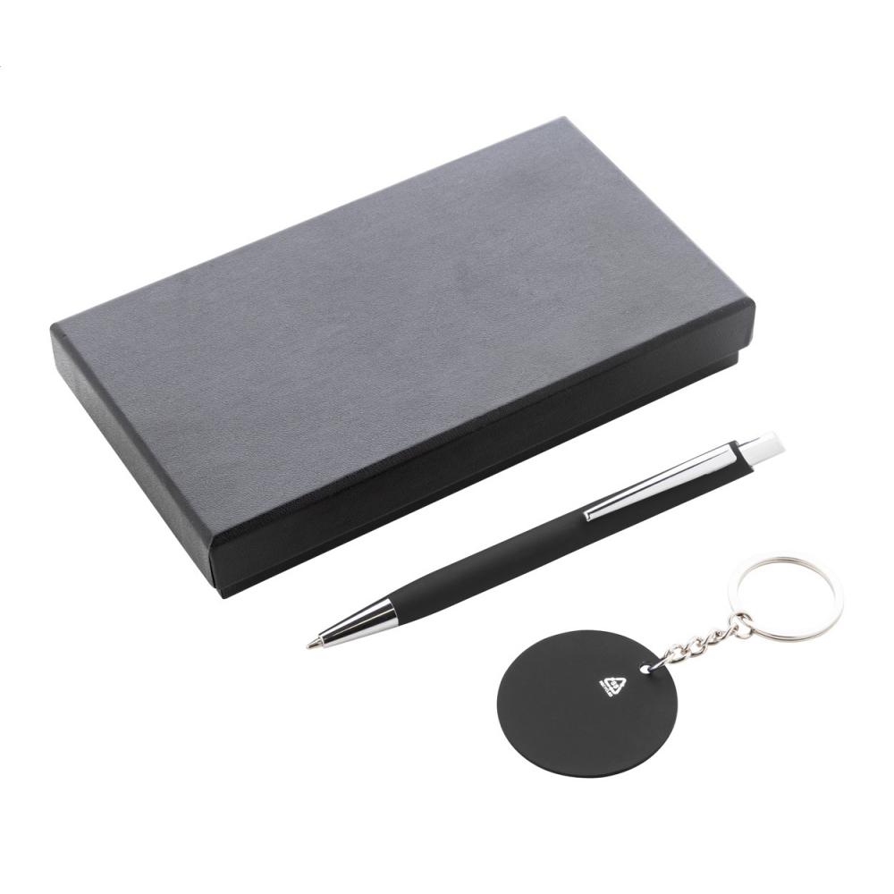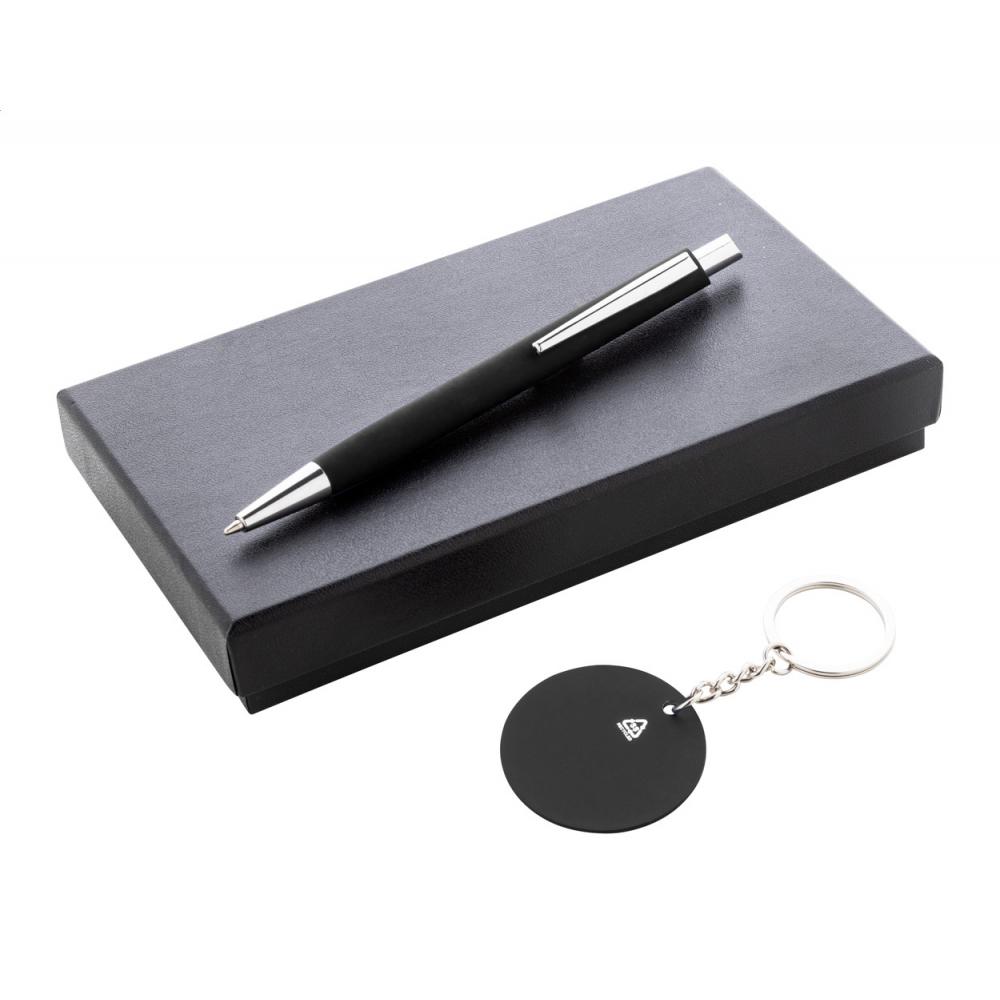 Набор из двух предметов в черной подарочной коробке. Включает в себя переработанный алюминиевый шариковый ручку с резиновым покрытием и синим стержнем, а также переработанный ключницу из нержавеющей стали с резиновым покрытием. Оба изделия имеют специальное покрытие для зеркальной лазерной гравировки.