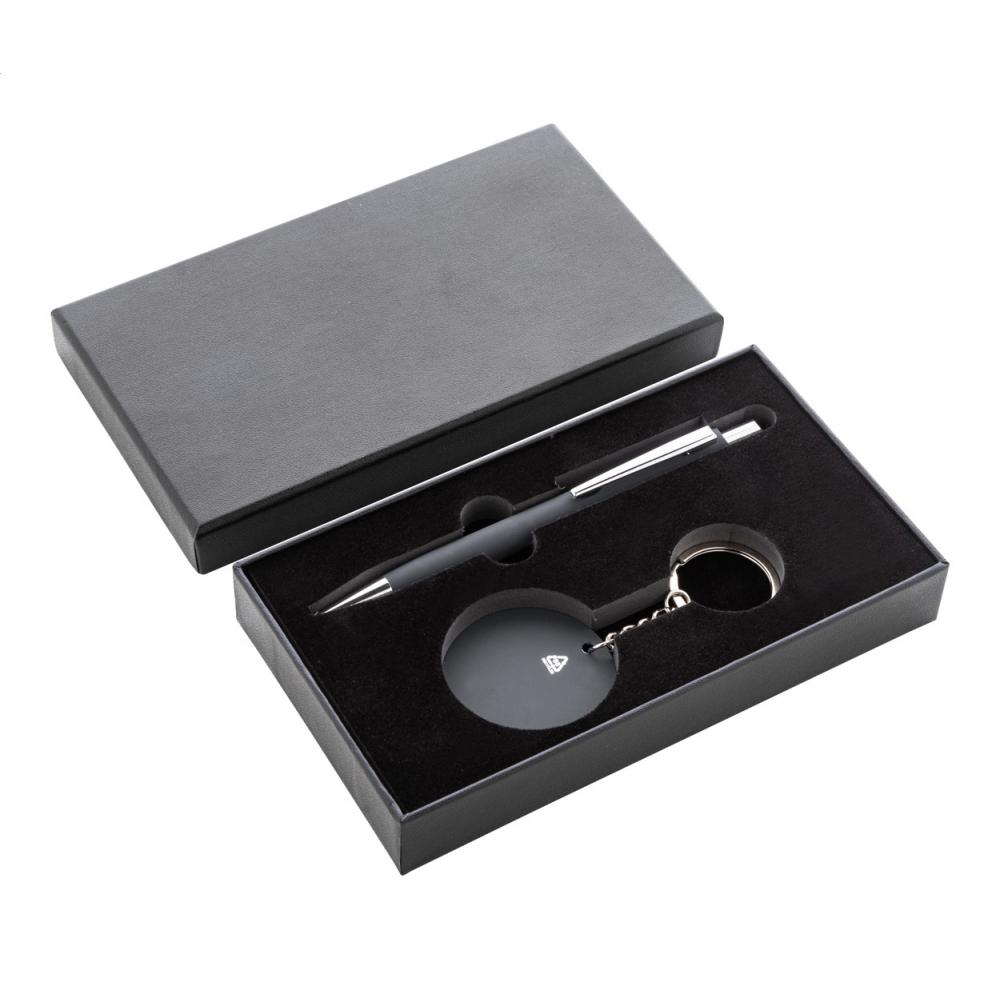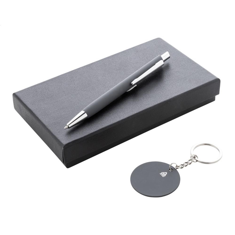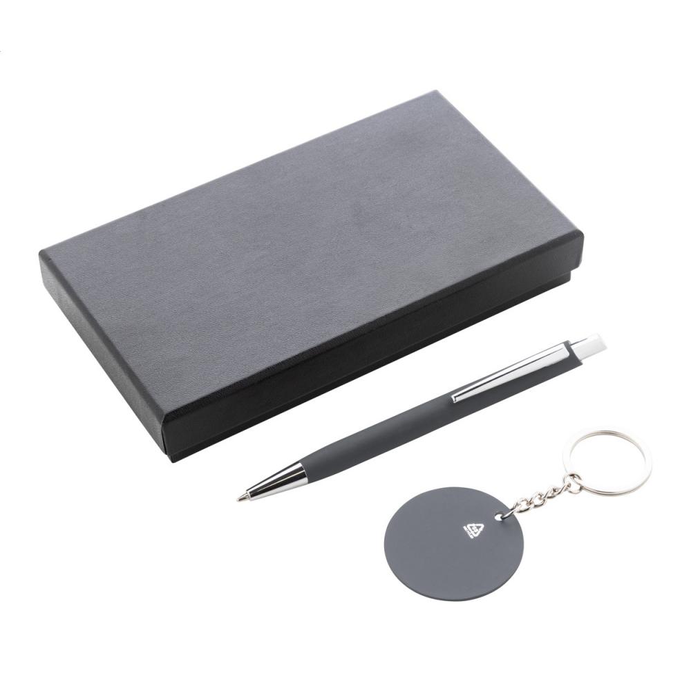 Набор из двух предметов в черной подарочной коробке. Включает в себя переработанный алюминиевый шариковый ручку с резиновым покрытием и синим стержнем, а также переработанный ключницу из нержавеющей стали с резиновым покрытием. Оба изделия имеют специальное покрытие для зеркальной лазерной гравировки.
