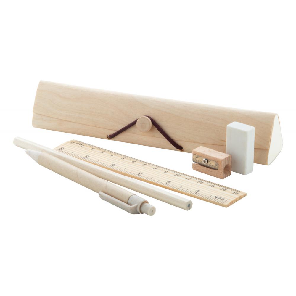 Набор деревянных канцелярских принадлежностей из 5 предметов в деревянном футляре для ручки. Включая шариковую ручку из переработанной бумаги (с синим стержнем), графитный карандаш (HB, неотточенный), линейку 15 см, точилку и ластик.