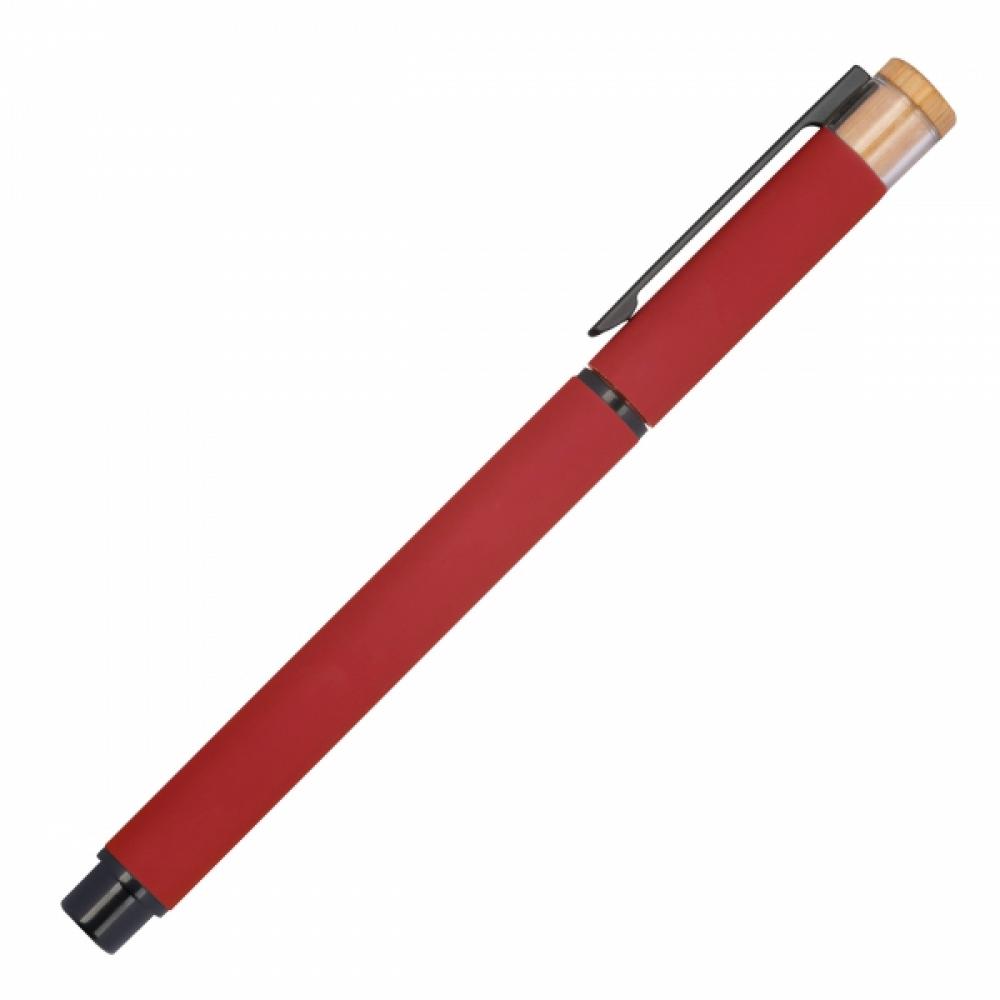 Набор для письма, состоящий из ручки с полугелевой синей пастой и роллера, изготовленного из переработанного алюминия, с металлической клипсой и бамбуковым толкателем, в экологичной упаковке.