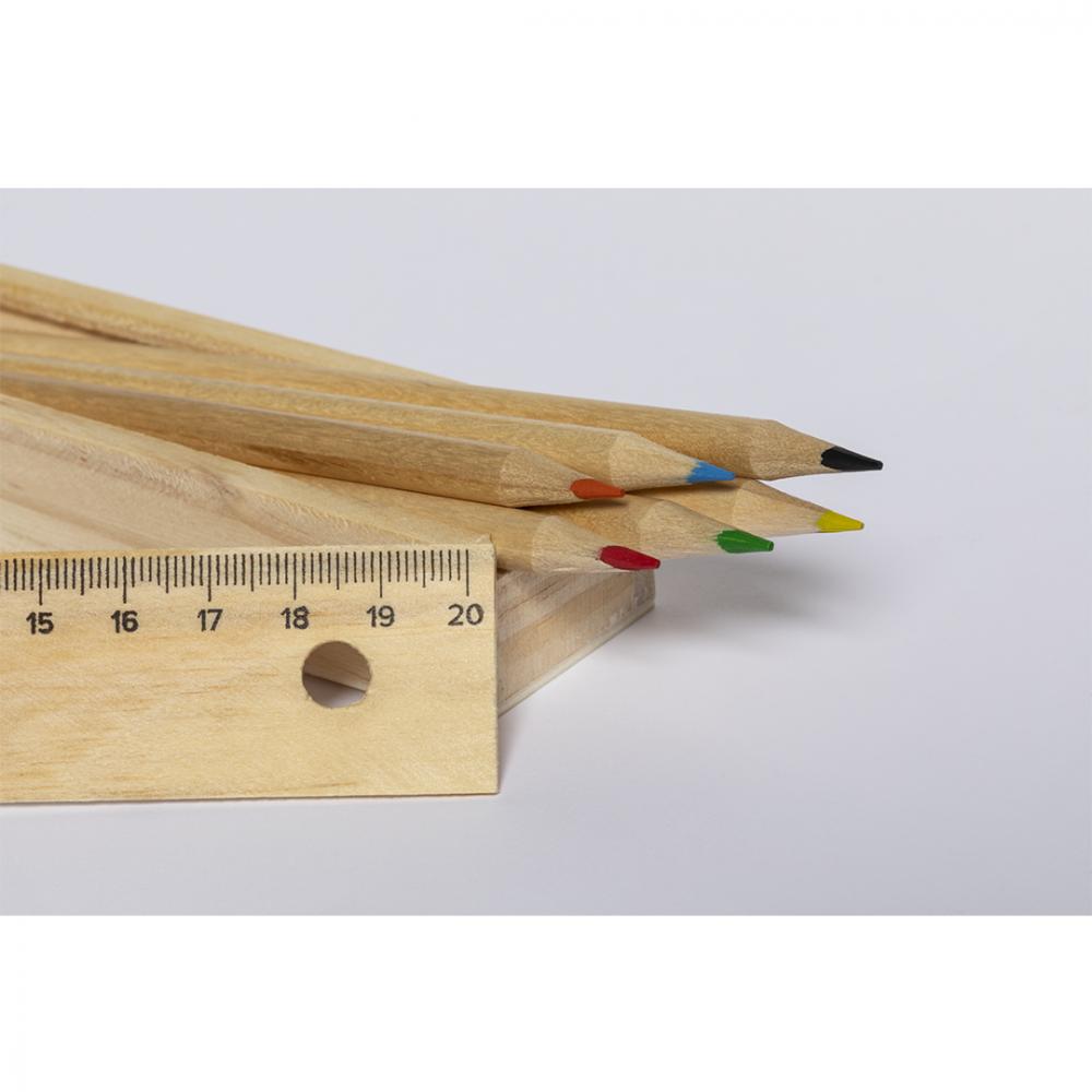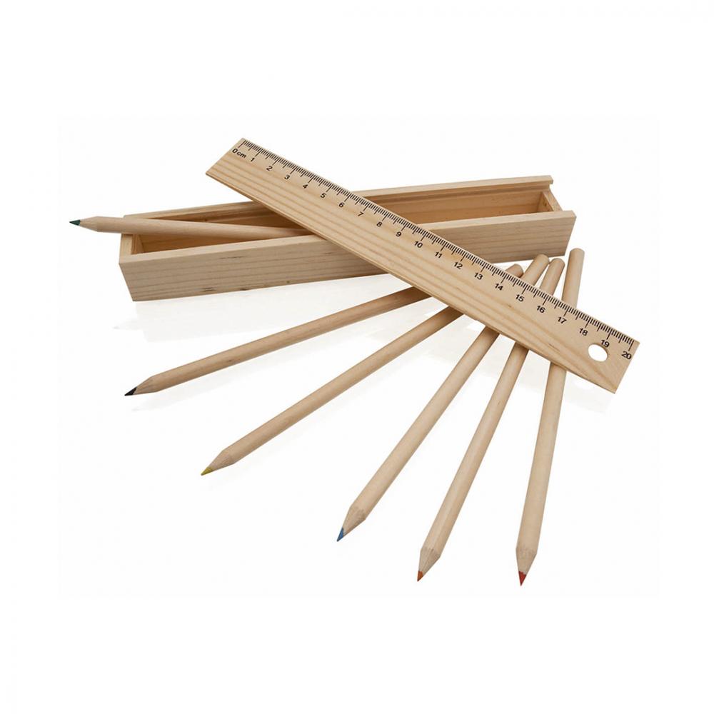 Особенности Набор из 6 карандашей в футляре из натурального дерева. Деревянные карандаши с круглым корпусом из натурального дерева и в широкой цветовой гамме. Нескользящая закрывающаяся крышка со встроенной 20-сантиметровой линейкой. 6 Карандашей Дерево