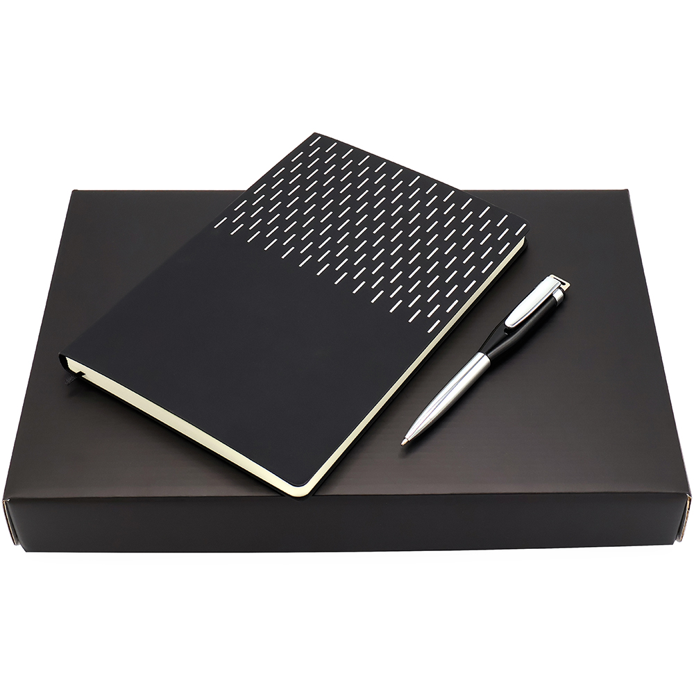 Подарочный набор в стильной цветной картонной коробке черного цвета (крышкой-дно). Внутри на аккуратном ложементе располагаются ежедневник А5 и элегантная металлическая ручка - флешка емкостью 64 ГБ.