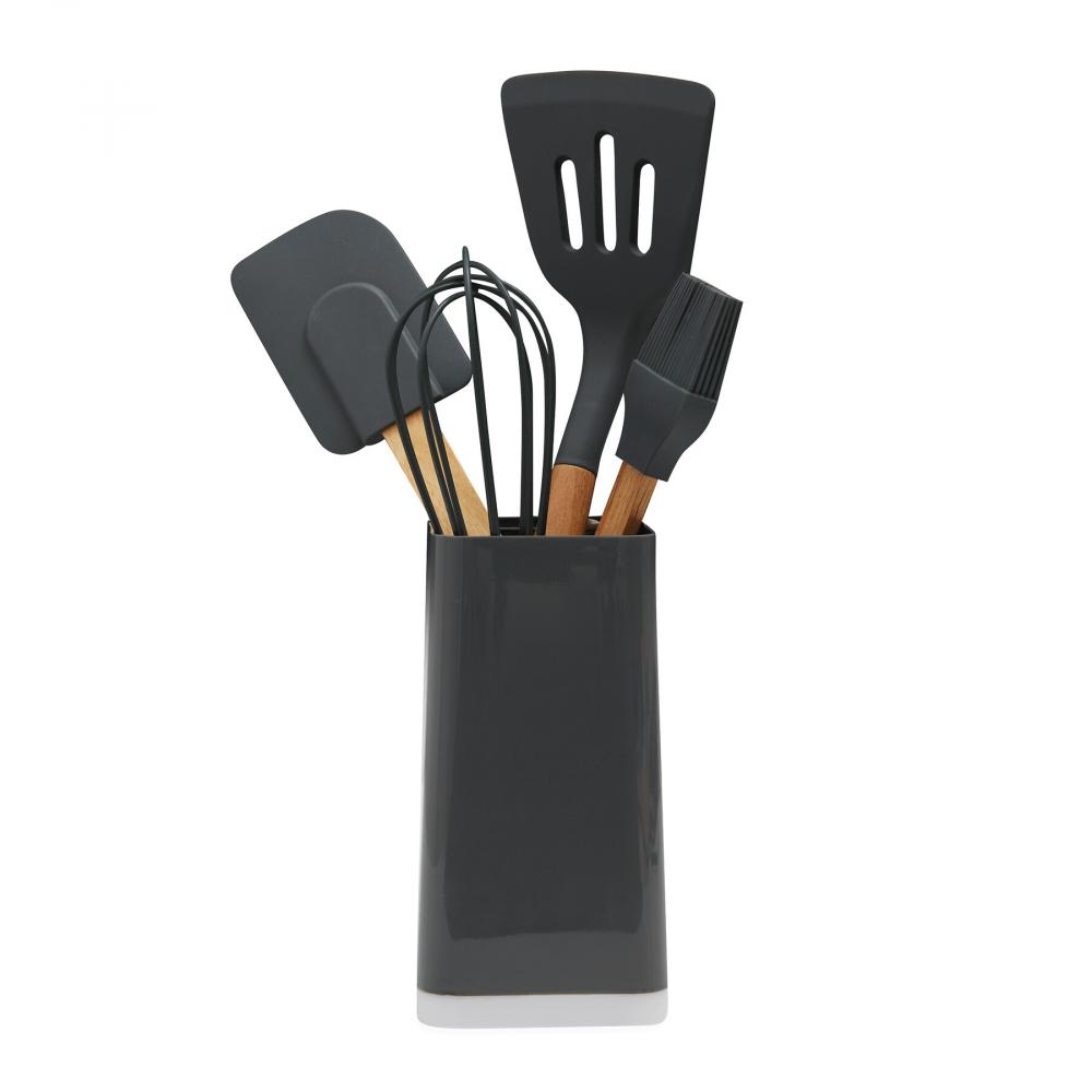 набор кухонной утвари из 5 предметов ИНСТРУМЕНТЫ для ПРИГОТОВЛЕНИЯ ПИЩИ: силиконовые кухонные принадлежности с деревянными ручками (лопатка, скребок для теста, щетка и венчик) в держателе