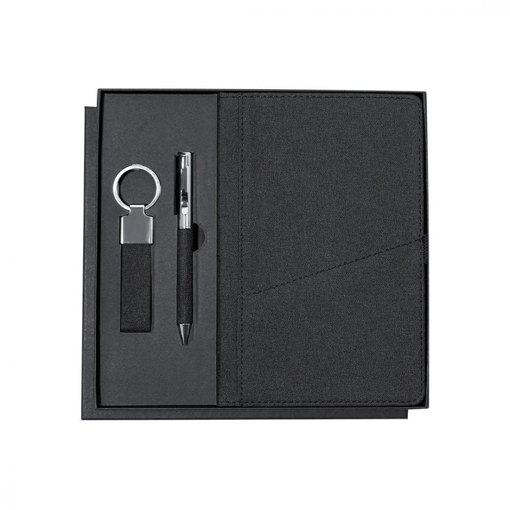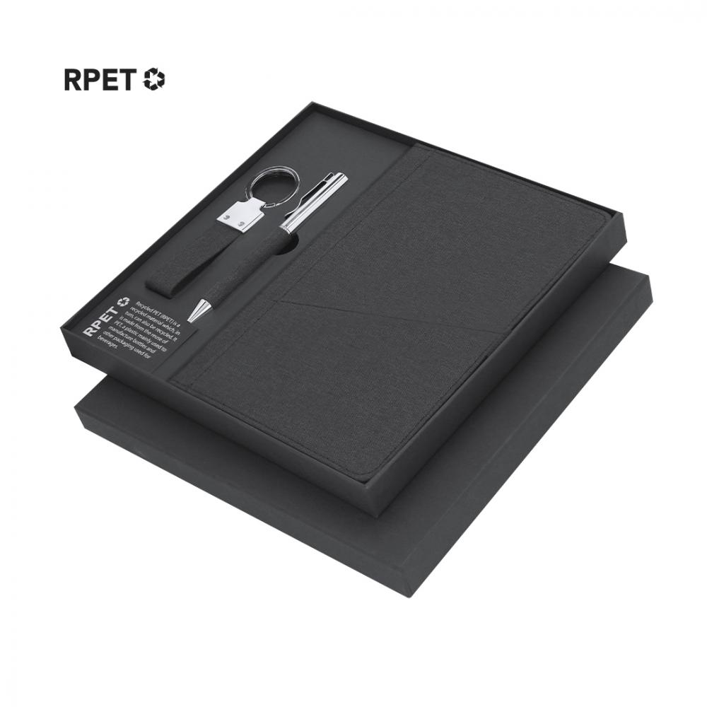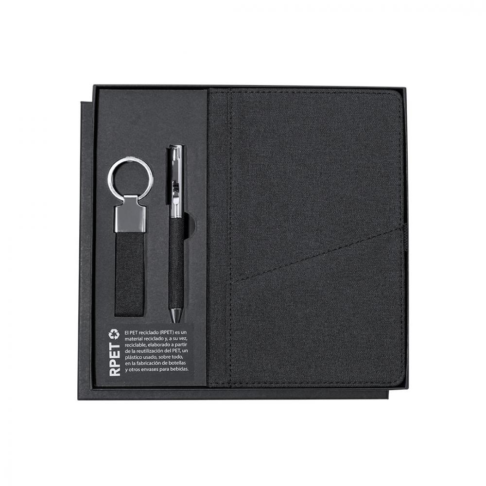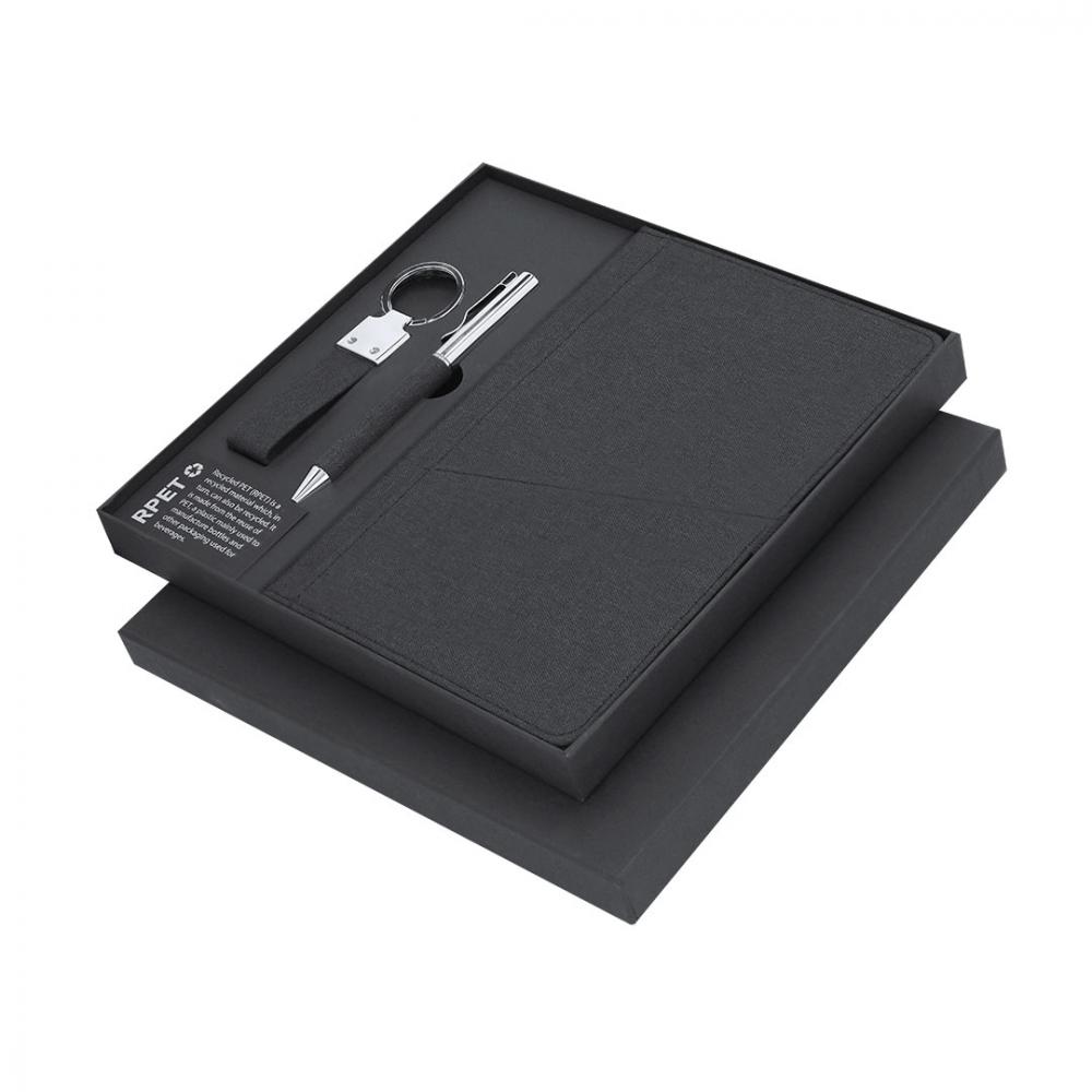 Элегантный премиум-набор, который включает: блокнот из RPET в элегантном черном цвете. Включает в себя эластичное закрытие, передний карман и тканевую закладку. Внутренняя часть с 80 линейными кремовыми листами. Ручка из RPET с матовым черным покрытием, вращающимся механизмом и синим чернилами. С клипом и полированным металлическим наконечником. Элегантный брелок с ремешком из RPET 300D полиэстера и хромированными аксессуарами. Набор представлен в индивидуальном матовом футляре, с вырезанным под каждый элемент набора и картой RPET внутри. Материал RPET изготовлен из переработанного пластика, способствуя повторному использованию пластиковых отходов и помогая поддерживать планету. Блокнот с твердой обложкой. 80 листов. Ручка. Брелок. Полиэстер 300D RPET/Металл.