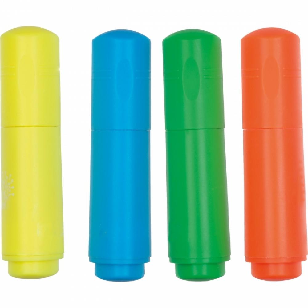 Набор текстовыделителей, состоящий из 4 разных цветов (желтый, синий, зеленый и оранжевый), упакованный в картонную коробку. Идеально подходит для рабочего стола или школьного рюкзака.