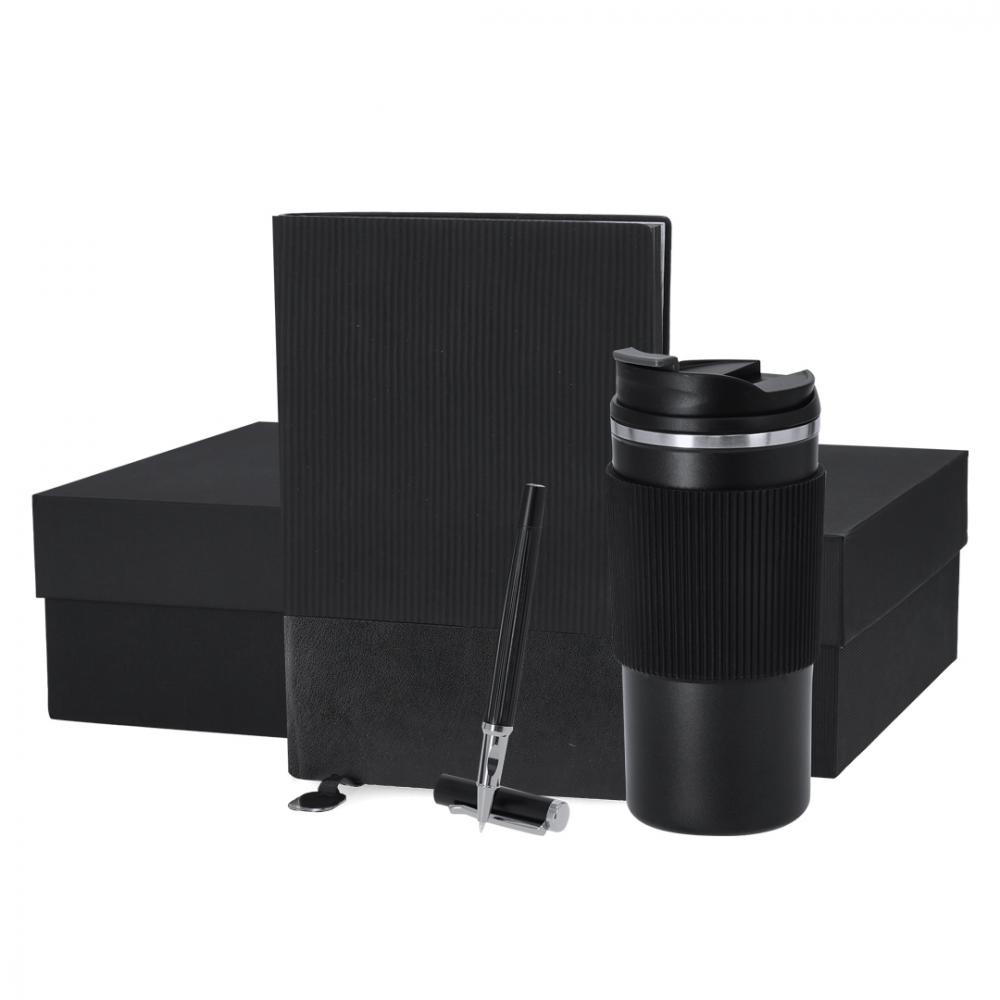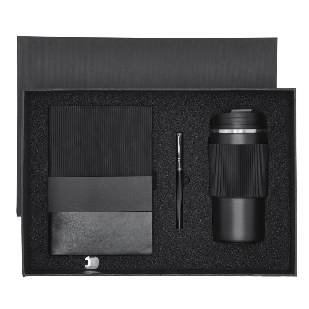 Термос-стакан из нержавеющей стали емкостью 470 мл, с двойными стенками, элегантного черного цвета. С соответствующей крышкой-дозатором и удобным открыванием, не содержит бисфенола А, силиконовой лентой в тон и нескользящим основанием. Блокнот в мягкой обложке из гладкой искусственной кожи элегантного черного цвета, сочетающий в себе гладкую и скошенную текстуру. В комплект входит тканевая закладка и специальная металлическая пластина для лазерной гравировки. Внутри 100 листов кремового цвета с разметкой в одну полоску и черными краями. Ручка-роллер с черной матовой отделкой и серебристыми металлическими деталями. Корпус со скосом, колпачок, клипса выполнены синими чернилами. В комплекте удобная ручка из полированного металла. Набор представлен в индивидуальном матовом футляре с внутренней штамповкой для каждого элемента набора. Термос из нержавеющей стали, 470 мл. Блокнот из полиуретана, гибкая обложка. 100 листов. Ролик алюминиевый
