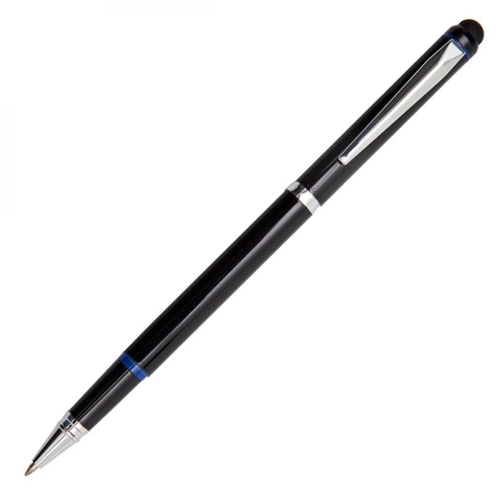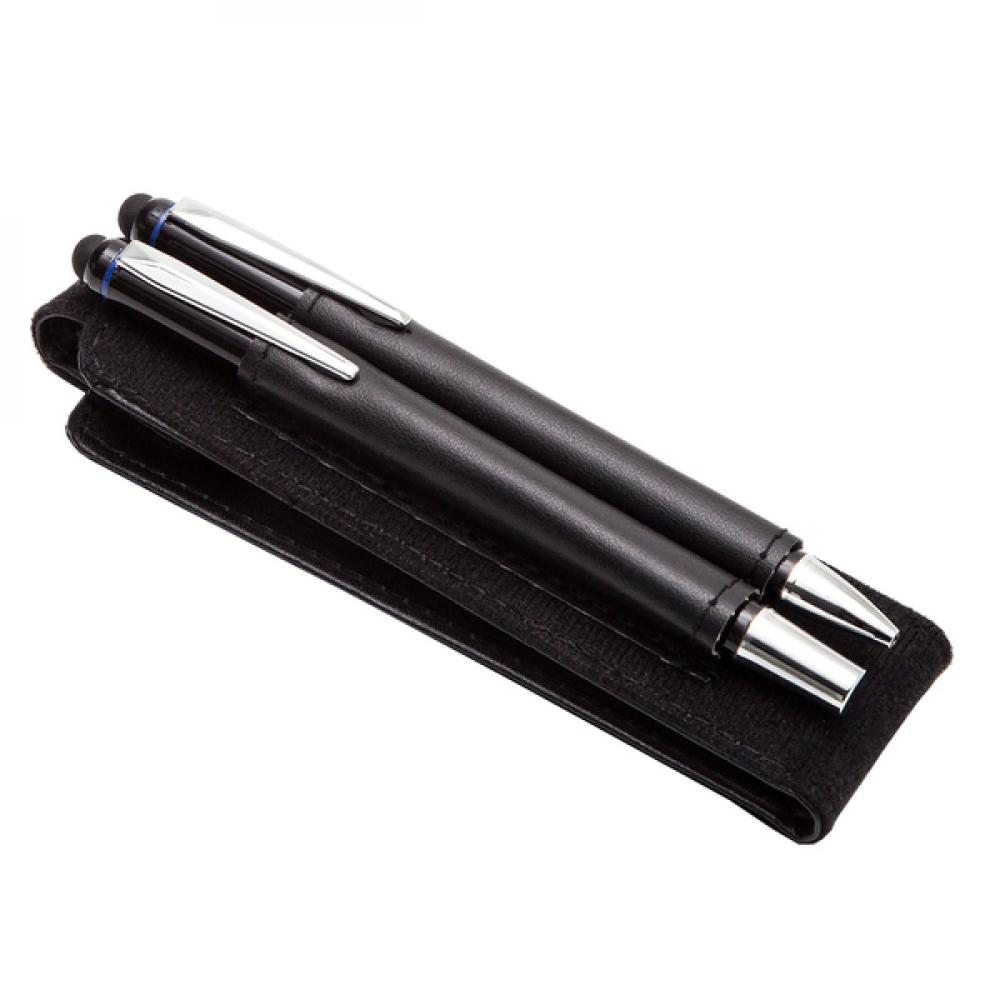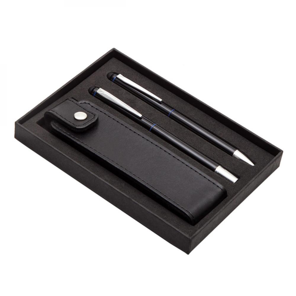 Набор для письма, состоящий из алюминиевой шариковой ручки и роликовой ручки со стилусом для сенсорного экрана в чехле из экокожи. Окрашенный ствол и хромированные накладки. Синий стержень для шариковой ручки 1,0 мм и синий роликовый стержень 0,7 мм. Упаковано в черную подарочную коробку.