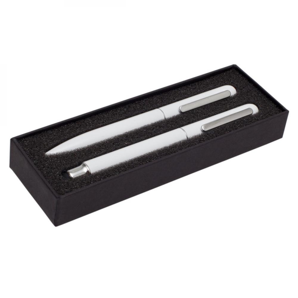 Набор из алюминиевой ручки и роликовой ручки. Роликовая ручка поставляется с черным резиновым сенсорным стилусом. Окрашенный ствол и хромированные накладки. Сменный стержень для шариковой ручки с синими чернилами 1,0 мм и стержень с роликом 0,7 мм. Упакован в картонную коробку черного цвета. Возможна печать XL.