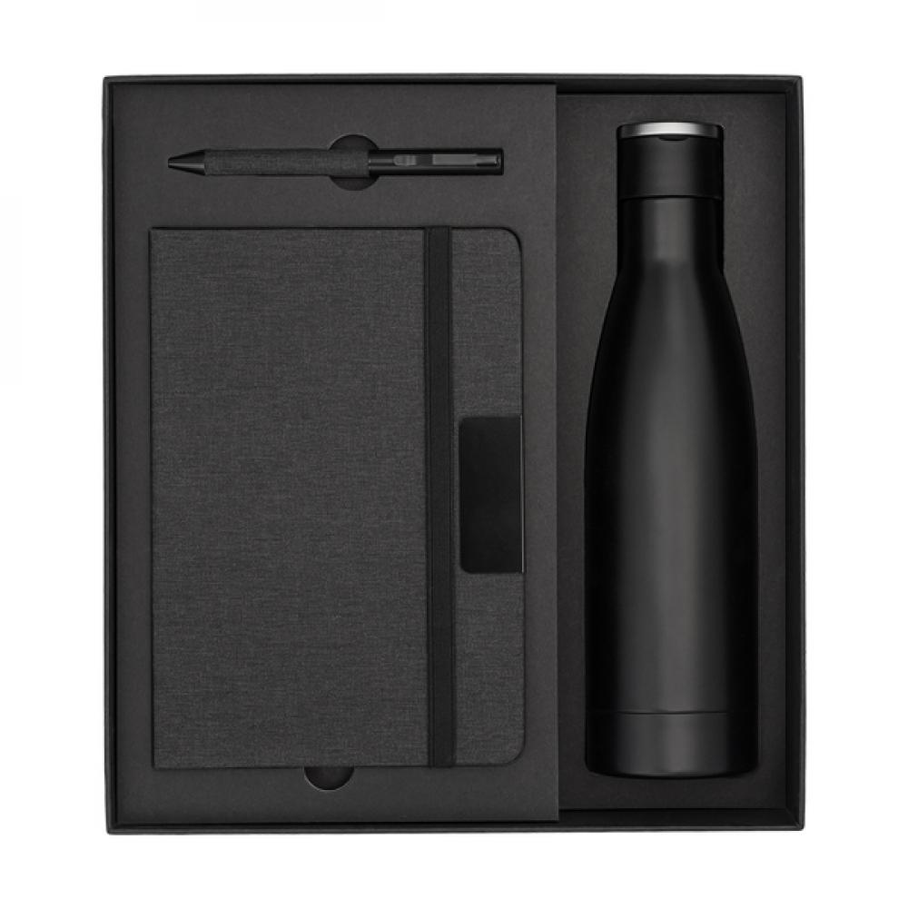 Набор для бизнеса, состоящий из вакуумной бутылки, блокнота и ручки. Все упаковано в элегантную черную коробку. Вакуумная бутылка из двойной стенки из нержавеющей стали (внутри сталь 18/8, снаружи 18/0) с складной ручкой. Сохраняет температуру выше 40°C до 15 часов. Объем 500 мл. Блокнот формата A5 с твердой обложкой из ткани RPET, украшенный черным металлическим элементом; 80 квадратных листов, вес 70 г/м². Металлическая ручка, украшенная тканью RPET. Синий стержень 1,0 мм.