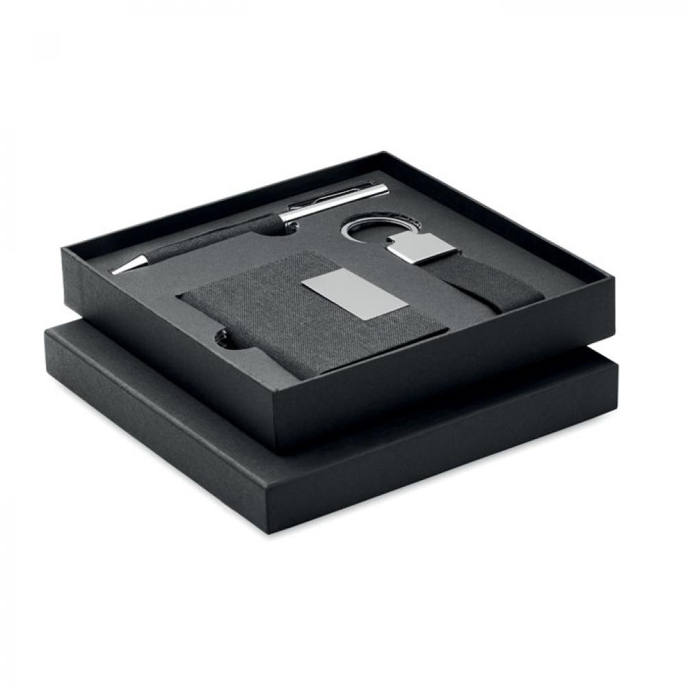 Подарочный набор из 3 предметов. В набор входят металлическая шариковая ручка, брелок для ключей и держатель для карт из перерабортанного полиэстера с металлическим шильдом. Синие чернила.
