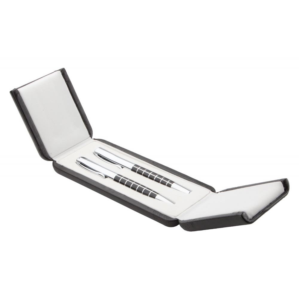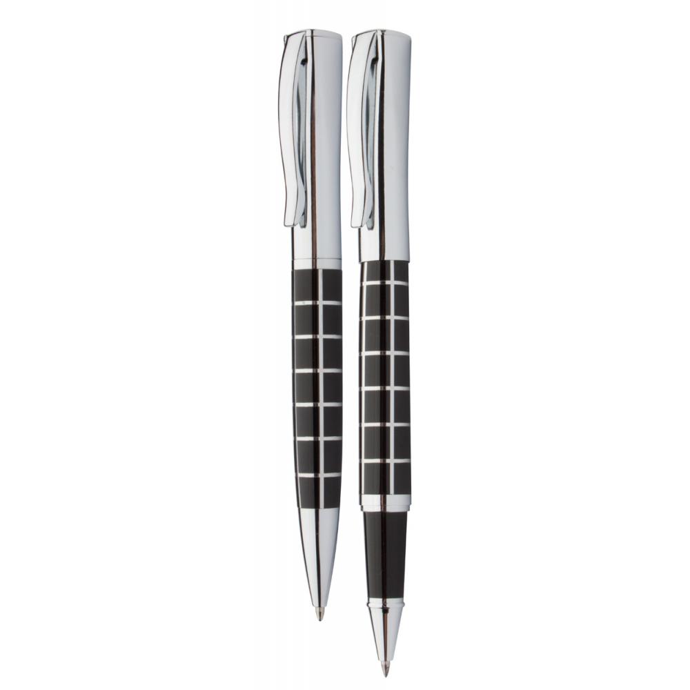 Элегантная металлическая шариковая ручка и набор роликовых ручек с блестящими хромированными деталями и узорчатым корпусом. В подарочной коробке из искусственной кожи, с синим стержнем. Брендовый продукт Андре Филиппа.
