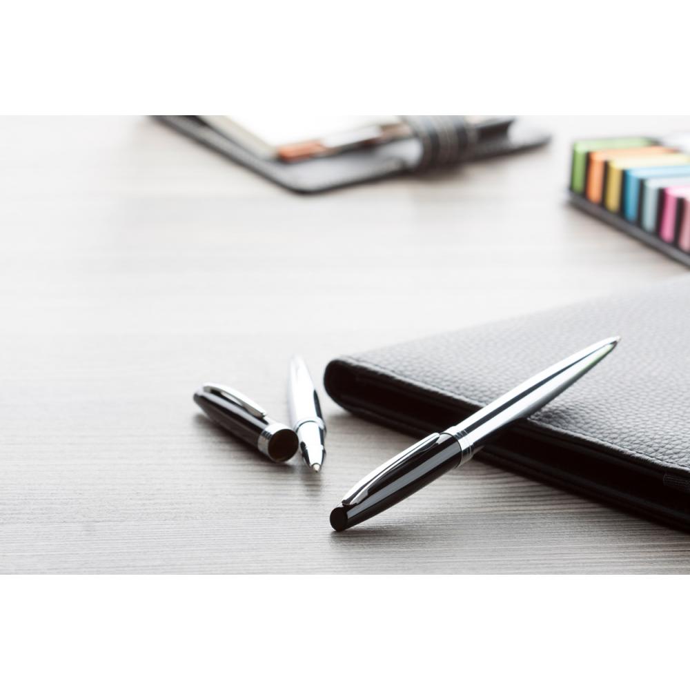 Металлическая шариковая ручка и ручка-роллер с черной лакированной крышкой, блестящим хромированным корпусом и зажимом. В подарочной упаковке, с синим стержнем.