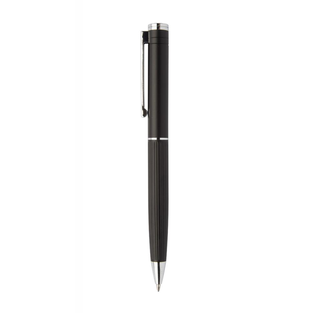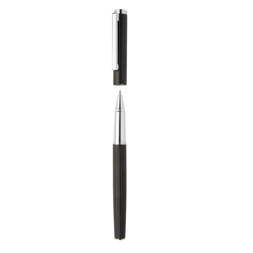 Элегантный набор шариковой ручки и роллербола из алюминия с текстурированным баррелью в полоску. В черной подарочной коробке, с синим заправочным стержнем.
