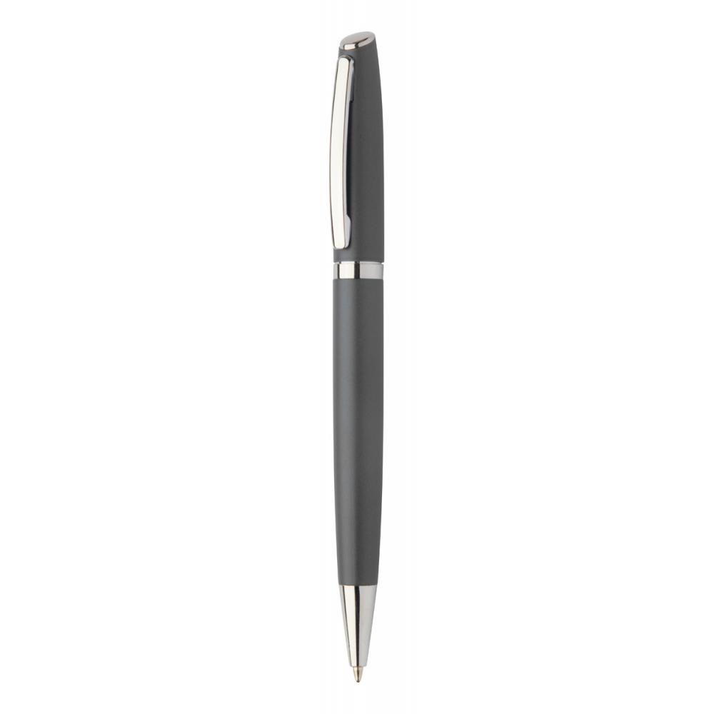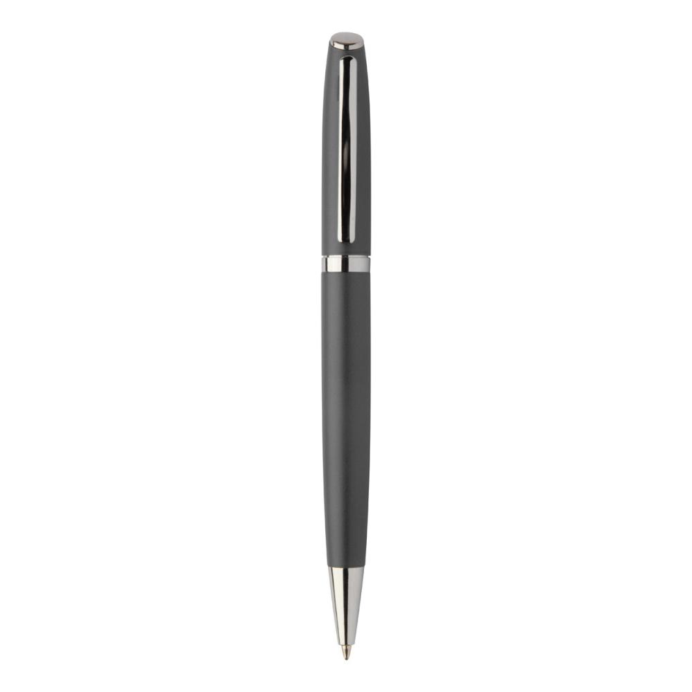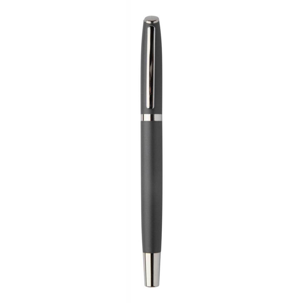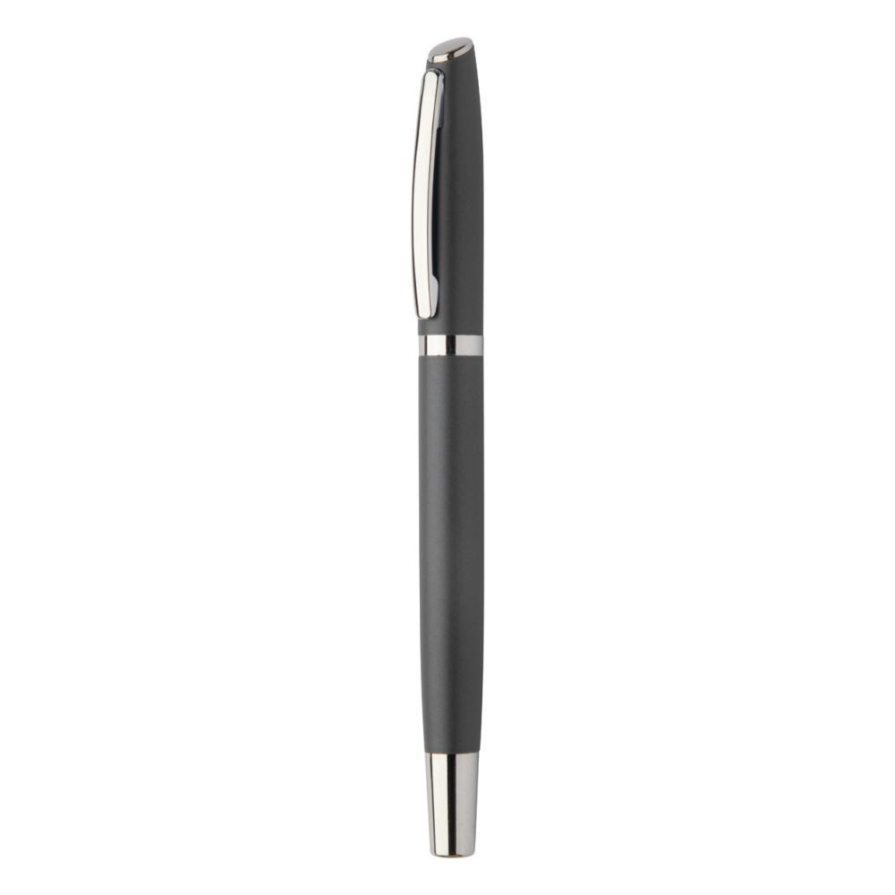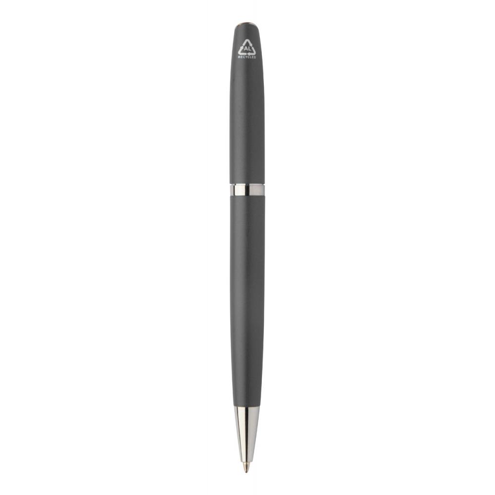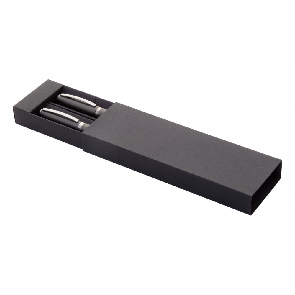 Набор переработанных алюминиевых ручек с роликовым и шариковым пишущими узлами в черной картонной подарочной коробке. С синей заправкой.