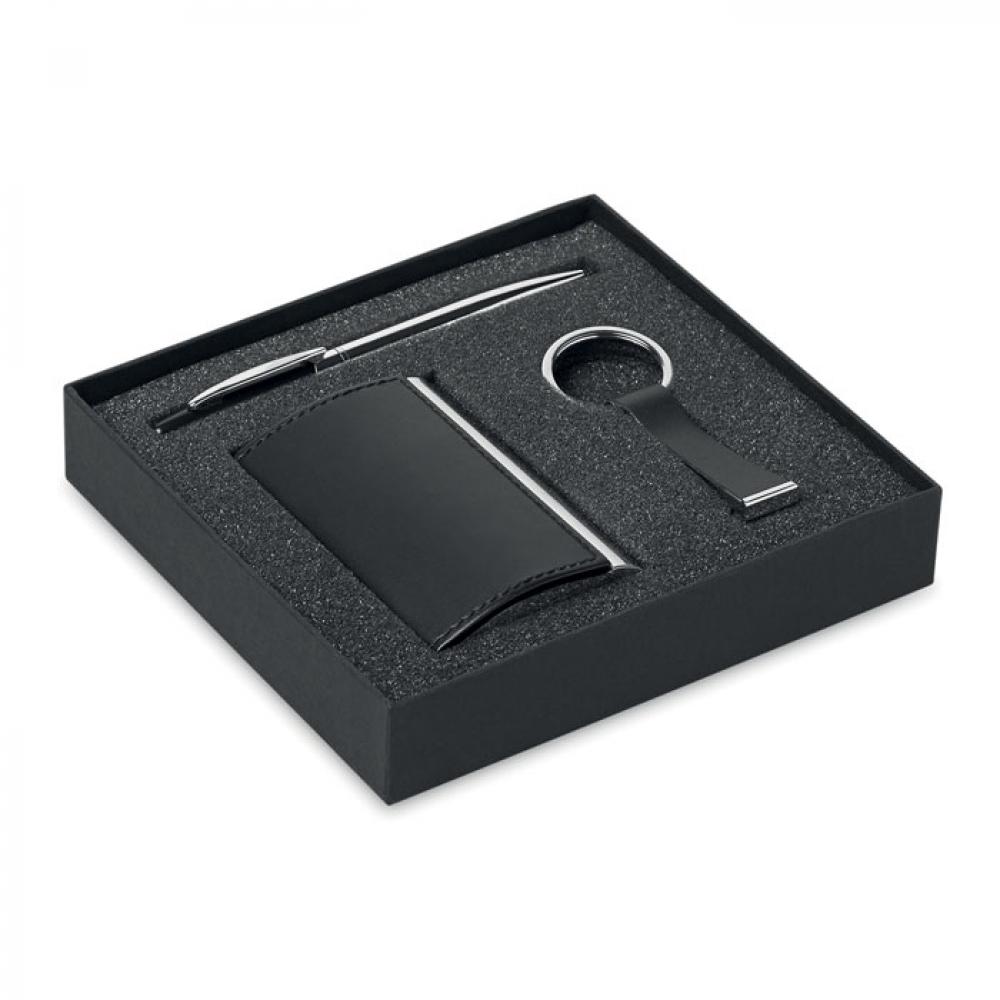 Подарочный набор. Состоит из металлической шариковой ручки с черными чернилами, брелка для ключей из искусственной кожи и визитницы.