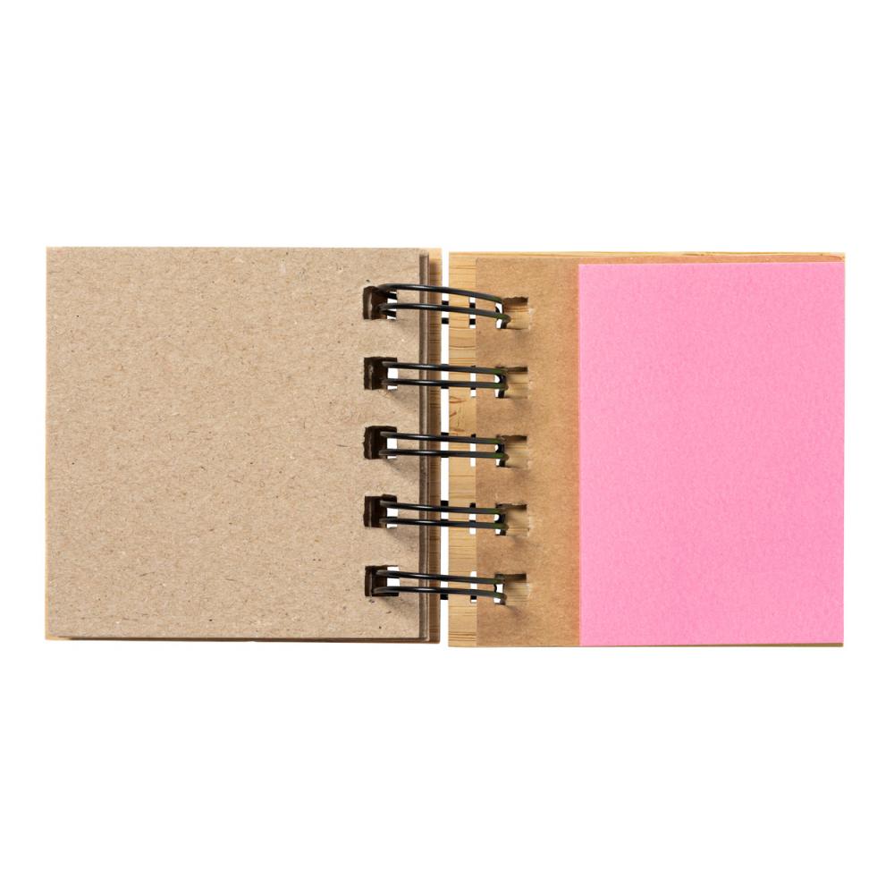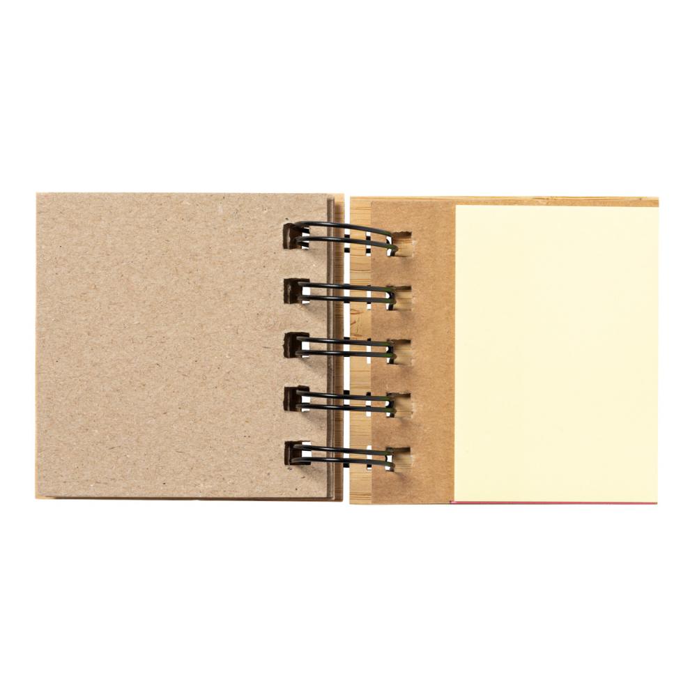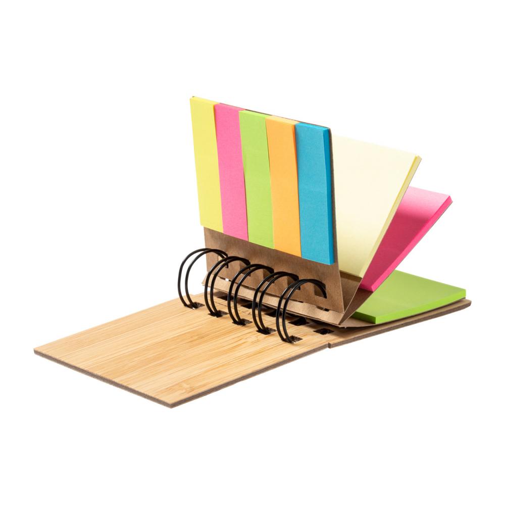 Блокнот на спирали, обтянутый бамбуком, с 75 большими (3 разных цветов) и 125 маленькими клейкими заметками (5 разных цветов).