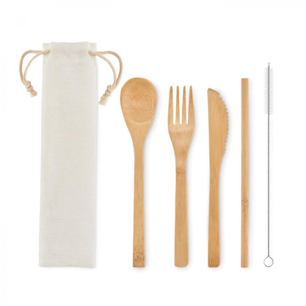 Набор столовых приборов из бамбука в холщовом чехле. Содержит нож, вилку, ложку и трубочку из бамбука с ершиком из нержавеющей стали.