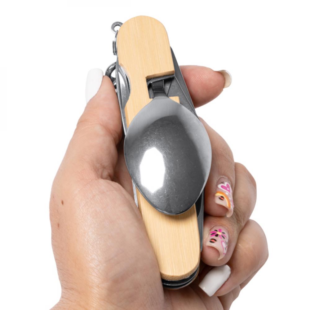 Многофункциональный набор столовых приборов с бамбуковой конструкцией и аксессуарами из нержавеющей стали. Штопор и перочинный нож. Упаковка в эко-дизайне.