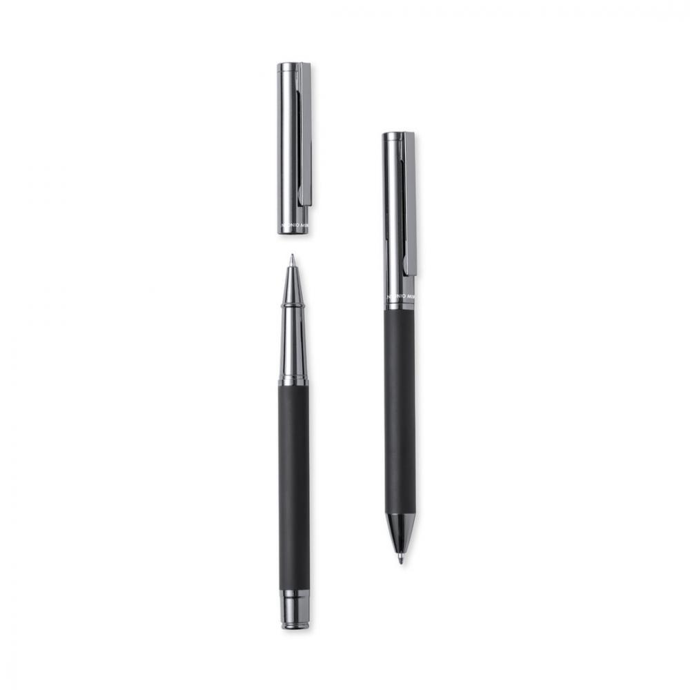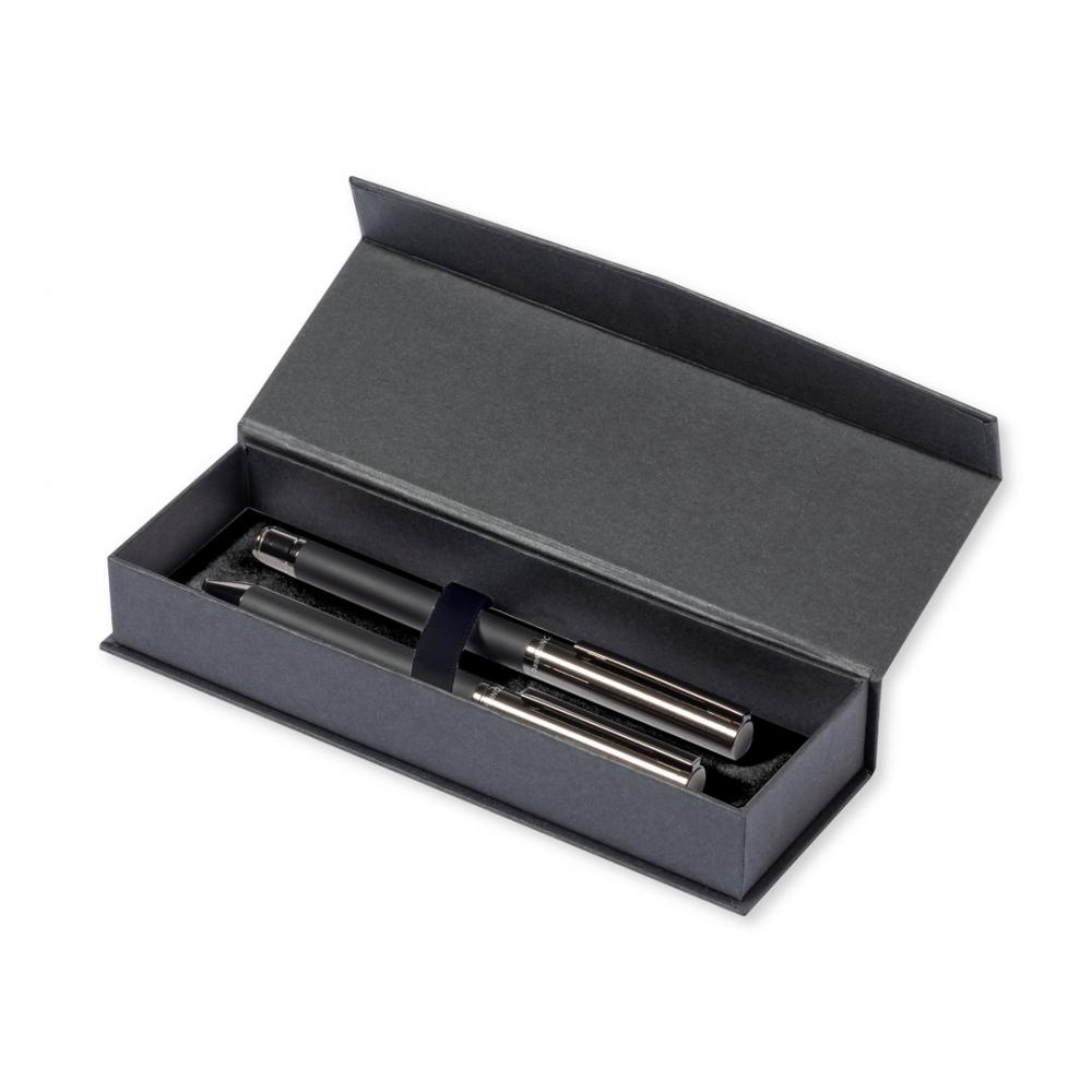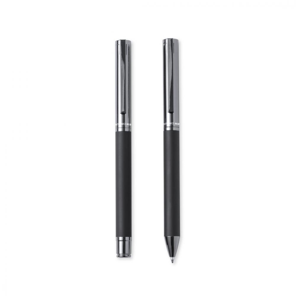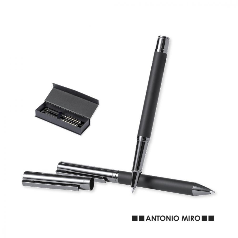 Набор шариковых ручек Антонио Миро и роликовых ручек. В том числе: металлическая шариковая ручка с матовым черным корпусом. Хромированная фурнитура и колпачок с логотипом бренда. Большой картридж и синие чернила. Металлическая ручка-роллер с матовым черным корпусом. Хромированная фурнитура и колпачок с логотипом бренда. Большой картридж и синие чернила.Представлен в элегантном и прочном индивидуальном черном корпусе с логотипом Antonio Miro. Магнитная застежка и соответствующий защитный рукав. Ручка и валик. Гигантская заправка Металл