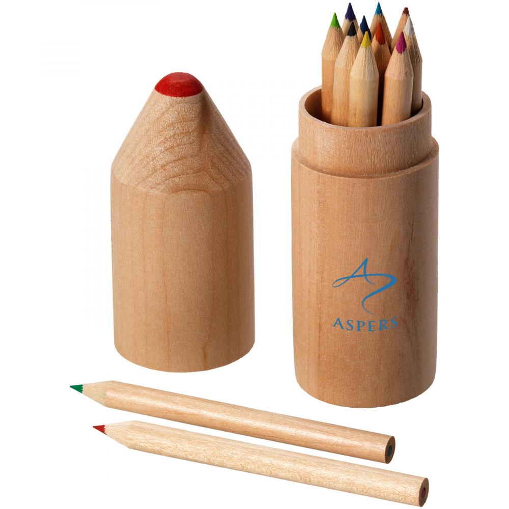 12 цветных карандашей в цилиндрической деревянной коробке в форме карандаша. Декорирование компонентов недоступно.