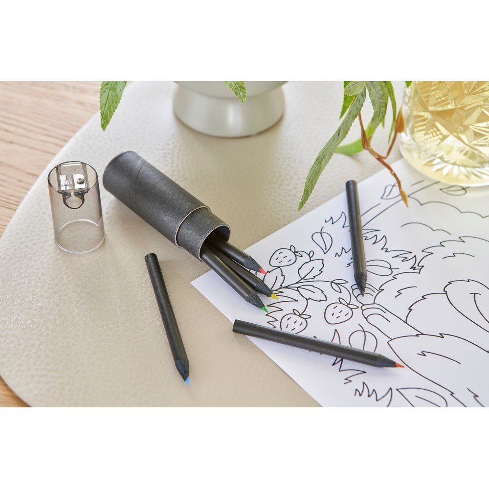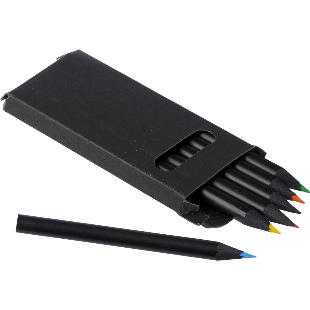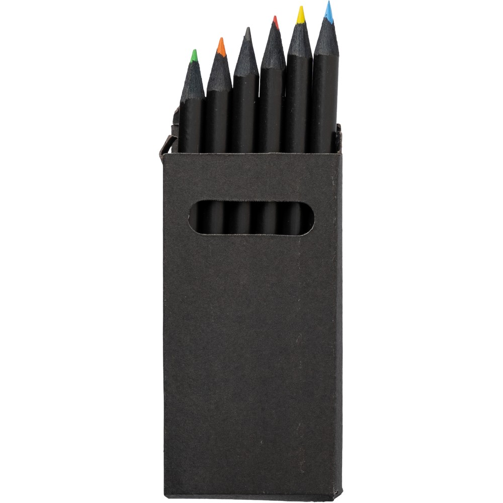 Набор из 6 цветных карандашей с декоративным черным корпусом, упакованный в черную переработанную картонную коробку.