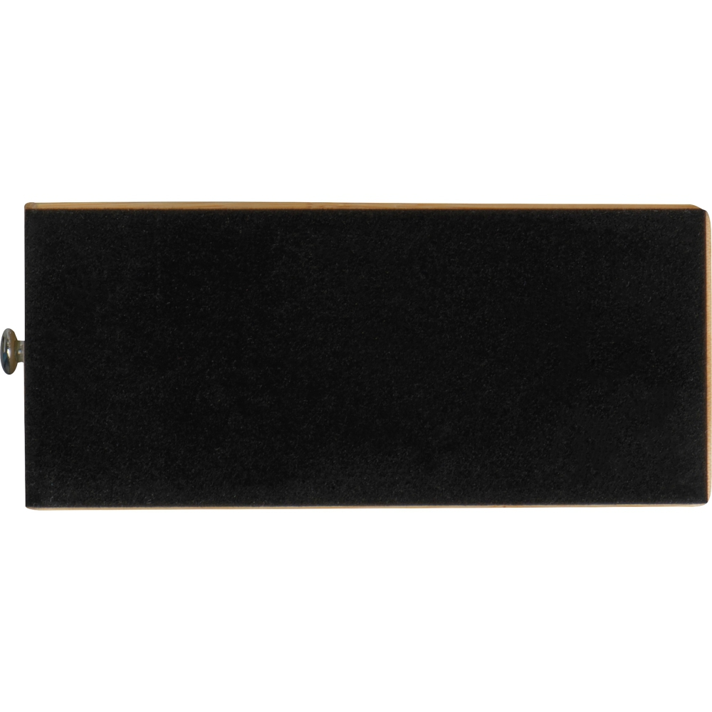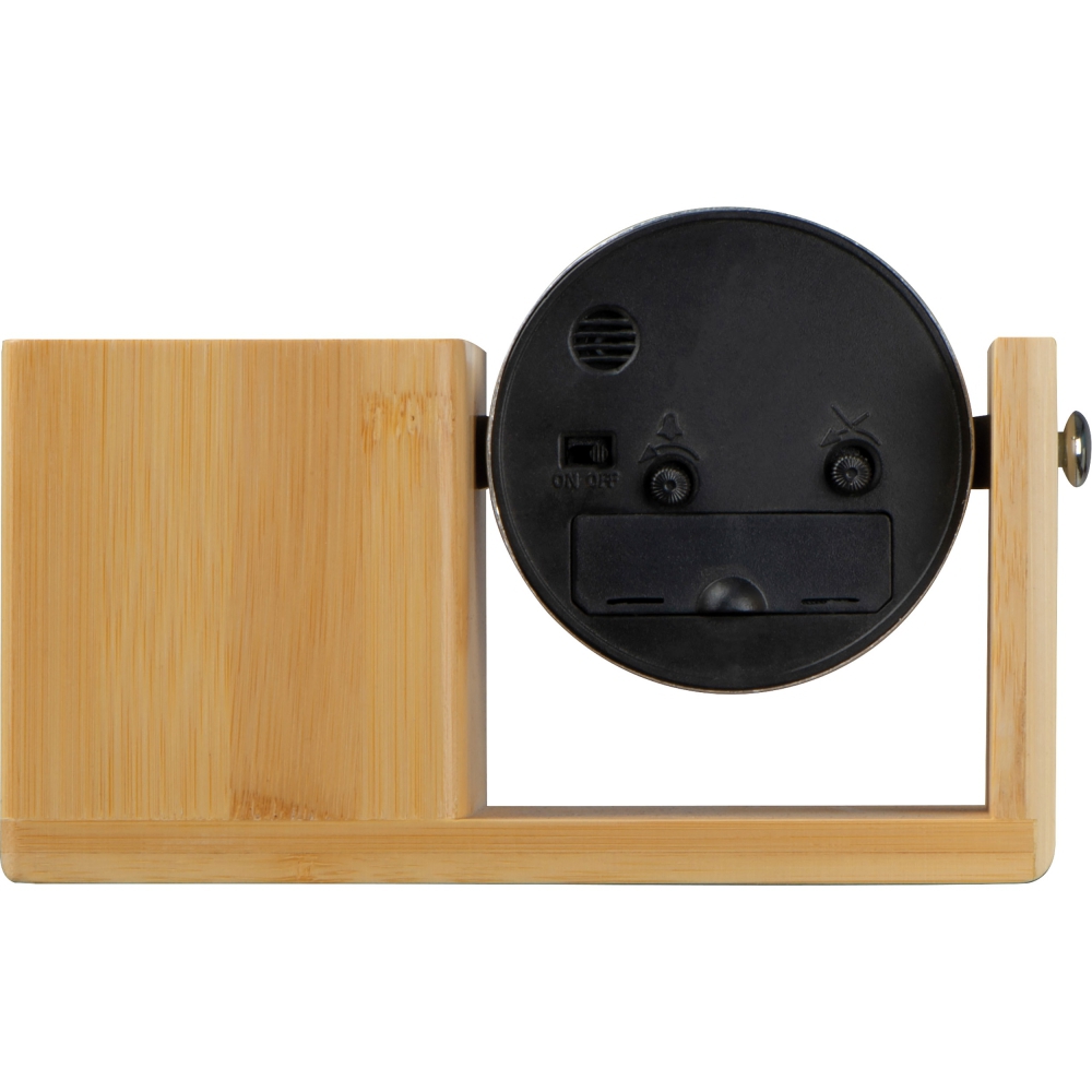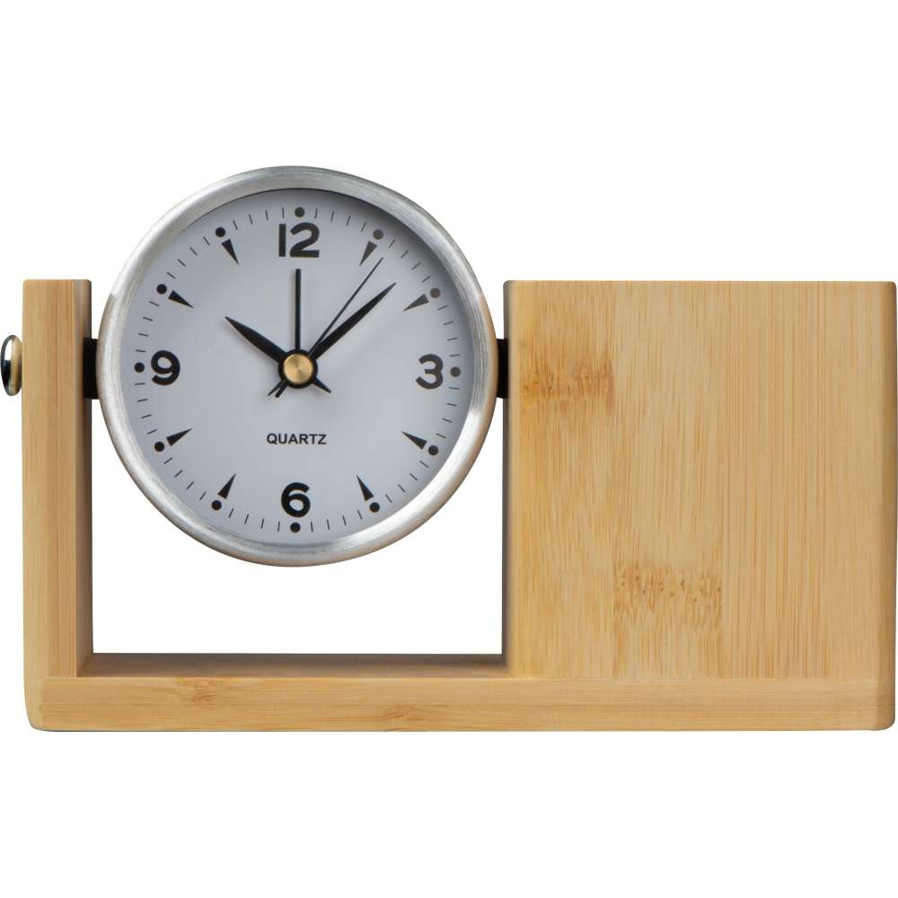 Алюминиевые поворотные часы размещены на деревянной подставке, вместе с контейнером для канцелярских принадлежностей.