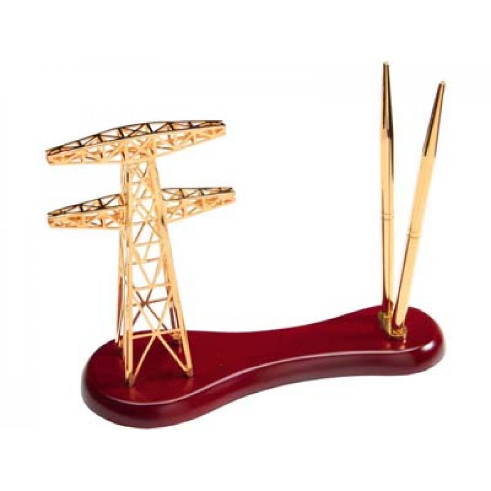 Настольный набор состоит из двух ручек золотистого цвета, размещенных на подставке, и фигурки высоковольтного столба ЛЭП. Такой тематический подарок отлично подойдет для руководителей или сотрудников энергетических компаний и станет оригинальным украшением рабочего стола.