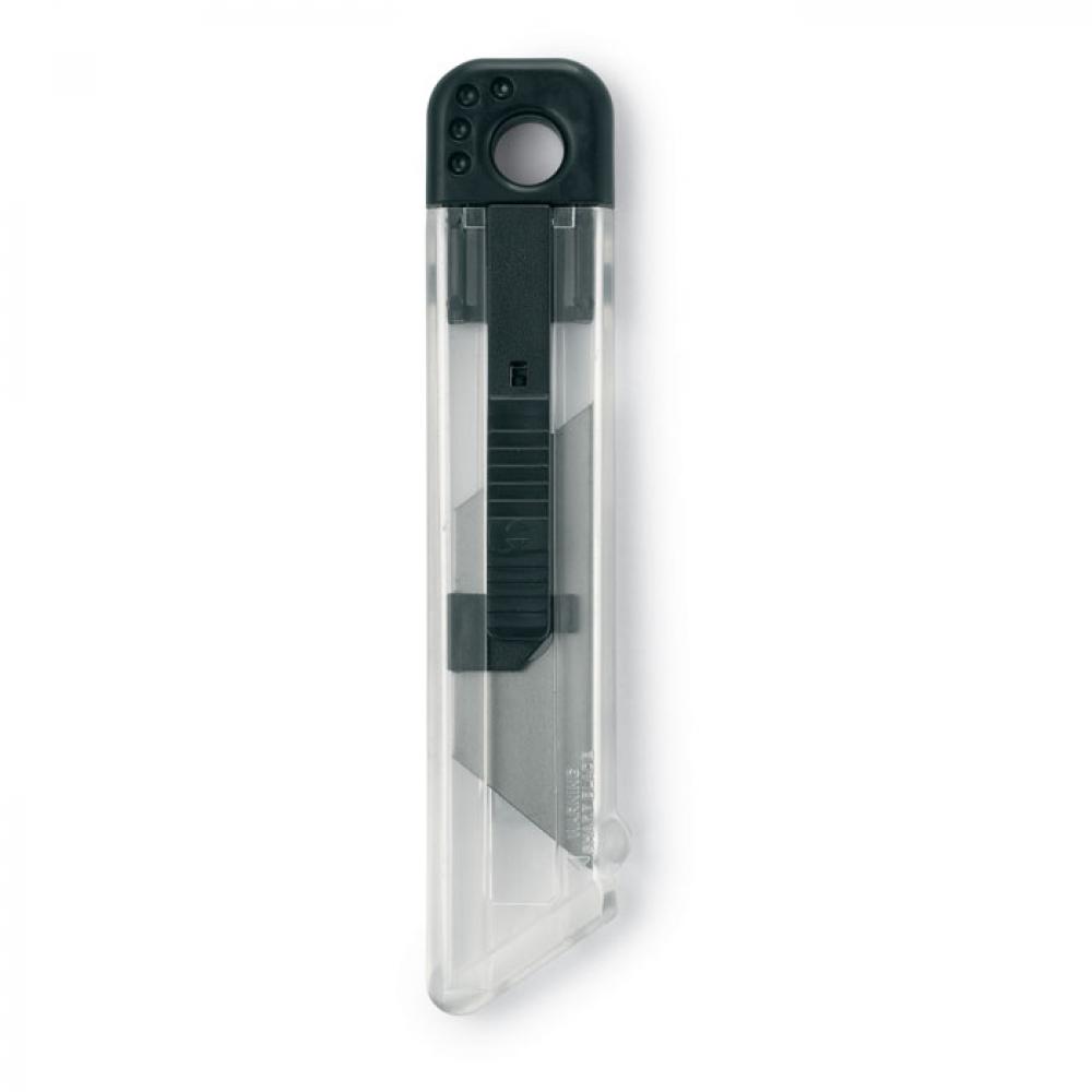 Канцелярский нож. Прозрачный корпус с цветными вставками.