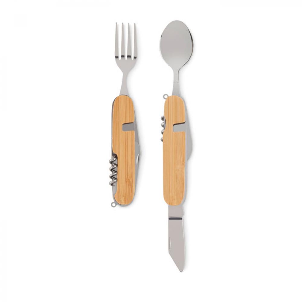 Перочинный нож со столовыми приборами в деревянном корпусе. Включает вилку, ложку, консервный нож, штопор и нож. Можно разделить набор на 2 части.