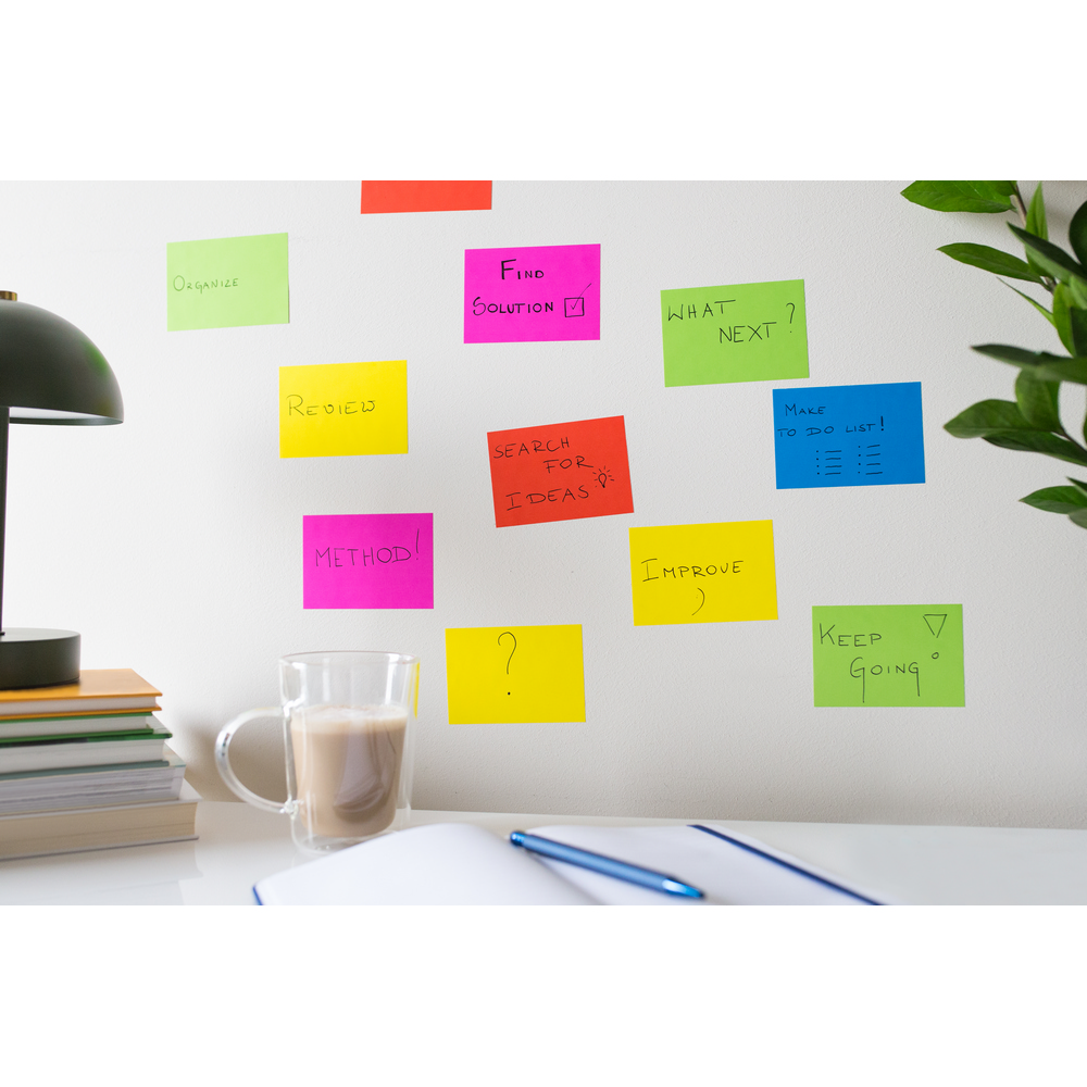Самоклеящиеся заметки, которые приклеиваются к поверхностям с помощью электростатического заряда, удобны для легкого перестановки заметок, 100 шт., изготовлены из бумаги. Произведено в Европе.