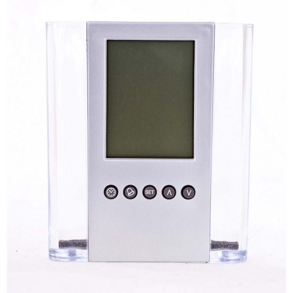 Прозрачный держатель для ручек с календарем, будильником и термометром.